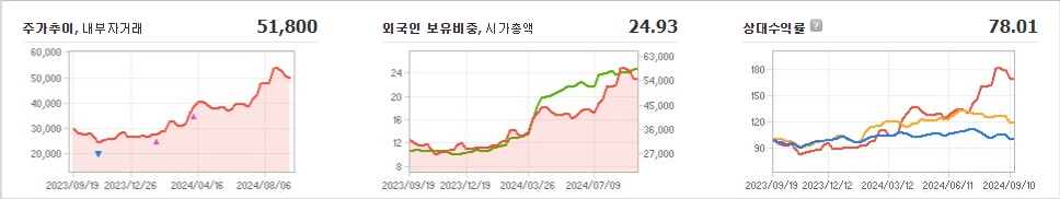 현대로템의 현재 주가는 51,800원으로, 전일 대비 -1.89원의 변동이 있었습니다. 주주 현황을 살펴보면, 현대자동차와 다른 세 명이 총 33.77%의 지분을 보유하고 있습니다. 현대로템은 운송 인프라 기업으로, 장중 기준 주가는 51,800원입니다. 이 회사의 시가 총액은 5조 6,536억 원이며, 발행 주식 수는 109,142,293주에 달합니다. 외국인 보유 비율은 24.93%이며, 장중 거래량은 1,616,517주에 이릅니다. 또한, 매출액은 18,423억 원을 기록했습니다.