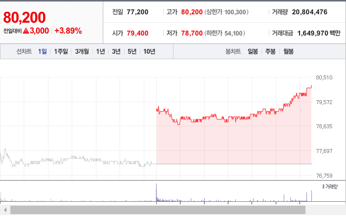 현재 삼성전자의 주가는 80,200원으로, 전일 대비 8.55원이 하락한 상태입니다. 주주 현황을 살펴보면 삼성생명보험과 그 외 15인이 총 20.08%의 지분을 보유하고 있습니다. 삼성전자는 주로 반도체 및 관련 장비를 제조하는 기업이며, 장중 주가는 80,200원입니다. 삼성전자의 시가총액은 478조 7,766억 원에 달하며, 발행된 주식 수는 5,969,782,550주입니다. 외국인 투자자들의 보유 비율은 56.26%이며, 장중 거래량은 22,061,478주에 이릅니다. 또한, 삼성전자의 매출액은 719,156억 원에 도달했습니다.