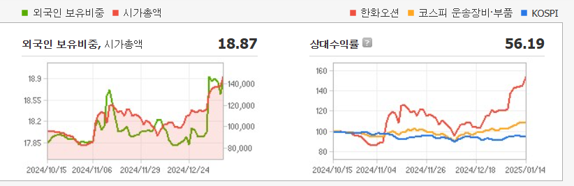 단기 포트폴리오를 구성할 경우 시가 총액과 장중 거래량을 살펴봐야 합니다. 한화오션의 시가 총액은 15조6271억 원이며 장중 거래량은 12,292,999원 을 기록했습니다. 대주주의 정보는 크게 중요하지 않을 수 있으나 장기적인 관점에서는 확인하는 것이 좋겠습니다.