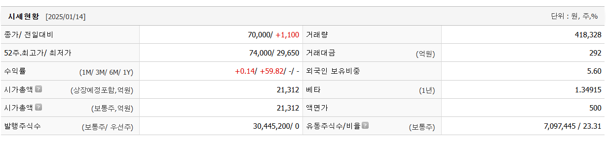 산일전기의 현재 주가는 70,000원입니다. 전일 대비 원 이동한 모습입니다. 시가 총액은 2조4843억 원이며 발행 주식은 총 30,445,200주 입니다. 외국인이 보유한 비중은 5.60%입니다. 산일전기 기업의 영업이익은 억 원을 달성했으며 배당 수익율은 % 입니다.