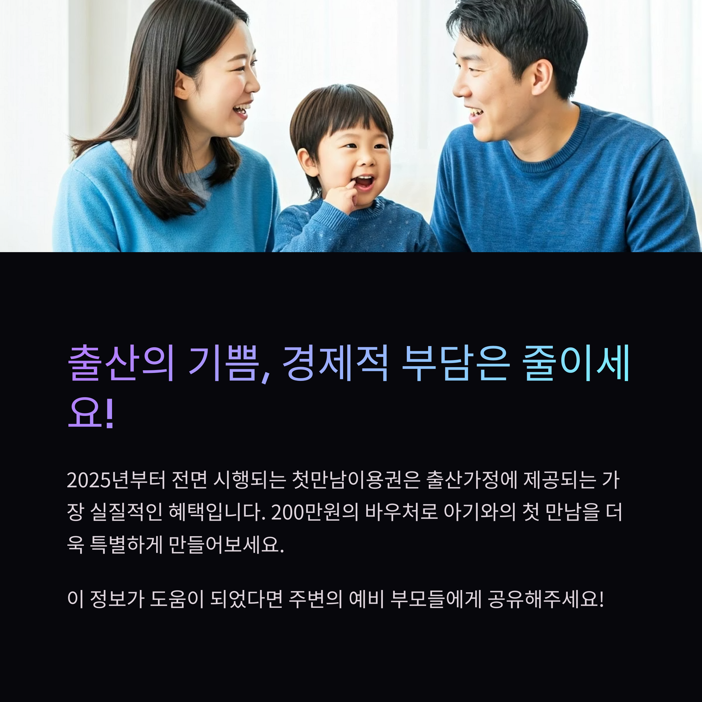 2025년부터 전면 시행되는 ‘첫만남이용권’은 출산과 동시에 지급되는 가장 실질적이고 확실한 복지 혜택 중 하나입니다. 특히 현금이 아닌 전자바우처 형태로 지급되기 때문에 계획적인 소비와 사용이 가능하며, 정부의 출산 친화 정책을 대표하는 사례라고 할 수 있습니다.