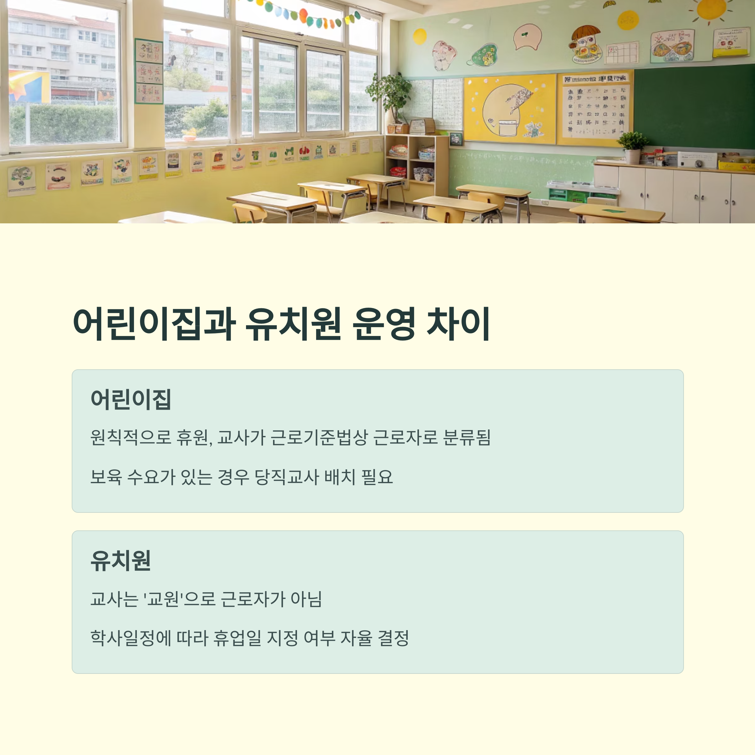 한편, 유치원은 사정이 다릅니다. 유치원 교사는 '교원'에 해당하여 근로자가 아니기 때문에, 유치원은 학사일정에 따라 근로자의 날을 휴업일로 지정할지 여부를 자율 결정합니다.