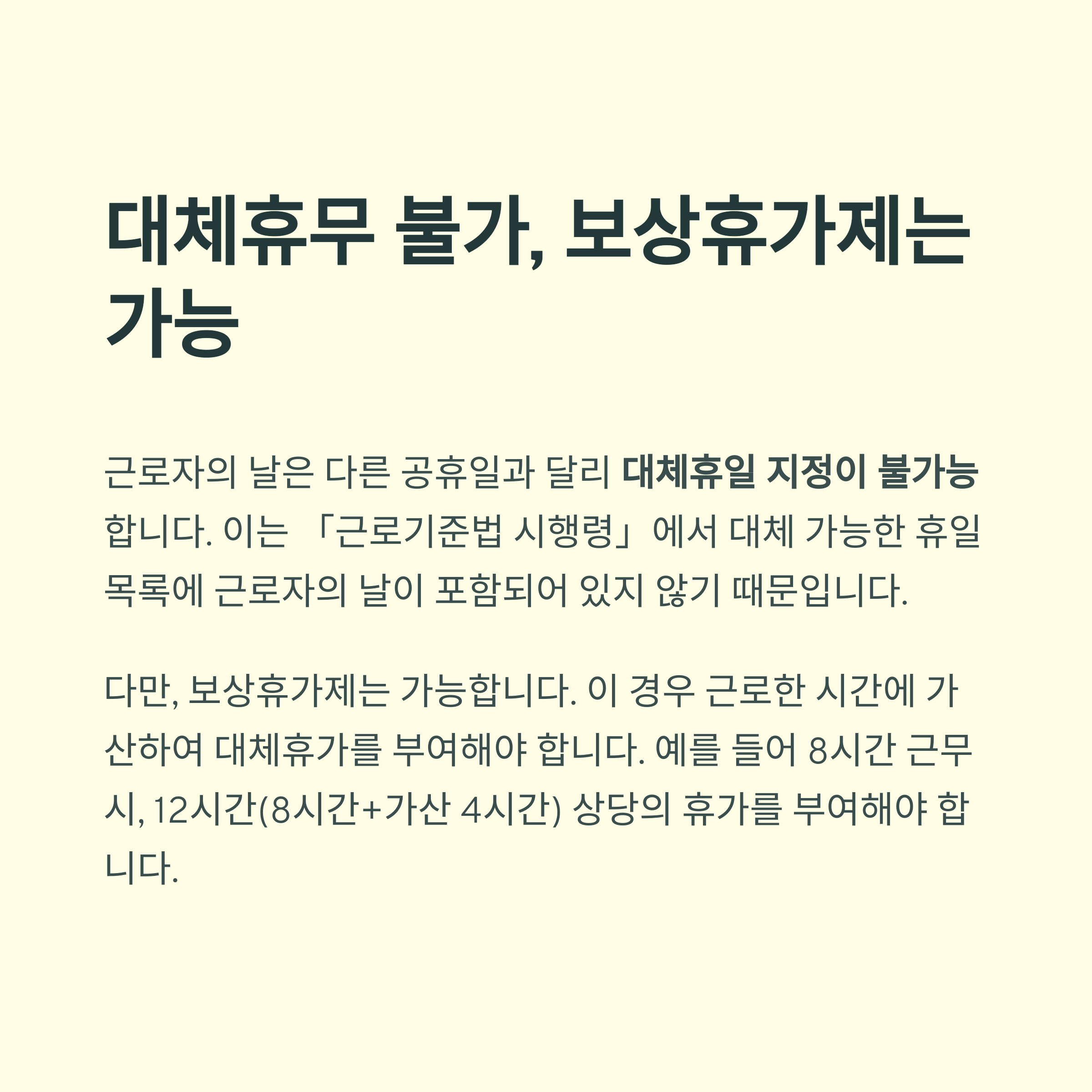 근로자의 날은 다른 공휴일과는 달리 대체휴일 지정이 불가능합니다. 설령 노사 합의가 있더라도 대체할 수 없습니다. 이는 「근로기준법 시행령」에서 대체 가능한 휴일 목록에 근로자의 날이 포함되어 있지 않기 때문입니다.