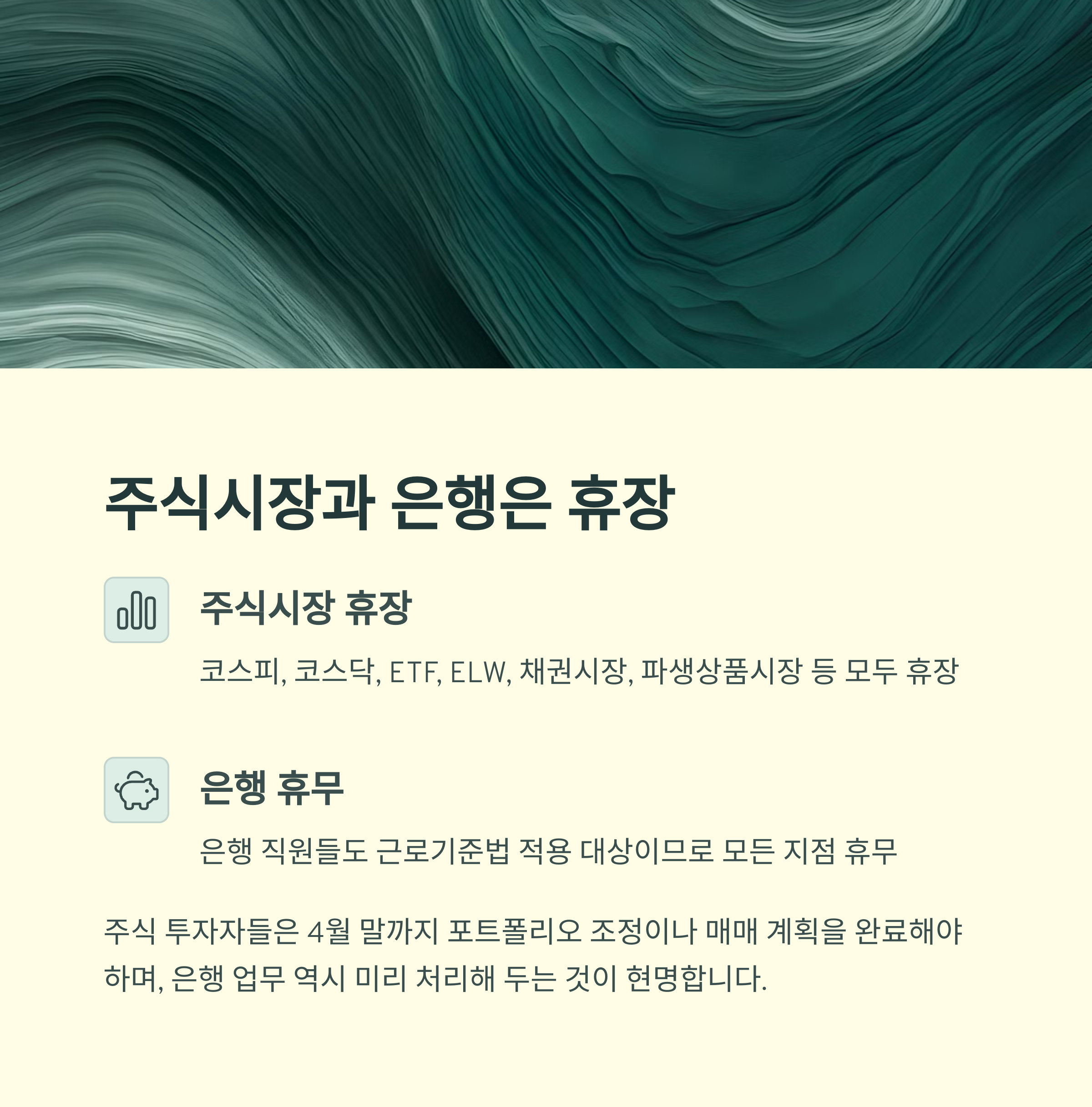 주식 투자자들은 4월 말까지 포트폴리오 조정이나 매매 계획을 완료해야 하며, 은행 업무 역시 미리 처리해 두는 것이 현명합니다.