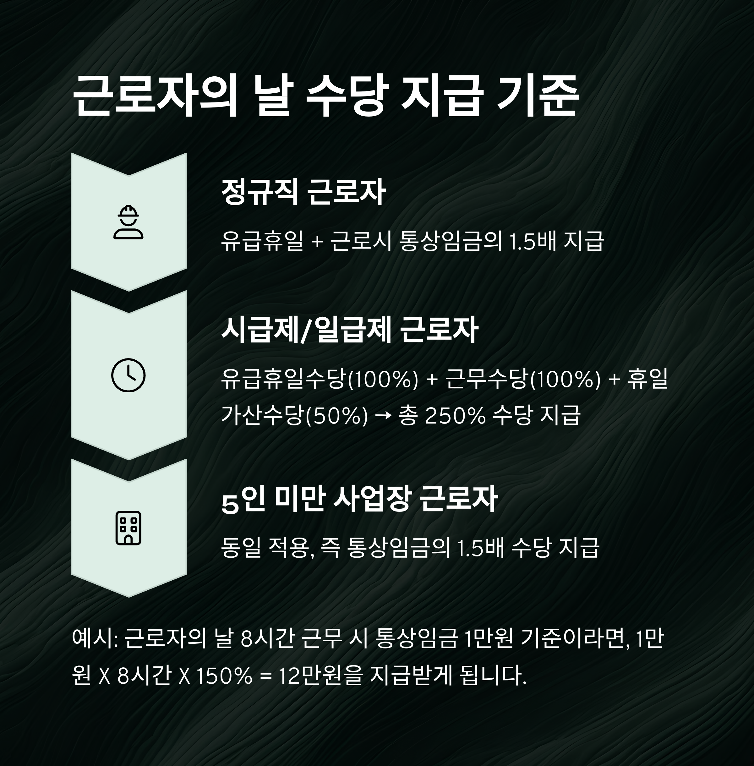 유급휴일수당(100%) + 근무수당(100%) + 휴일가산수당(50%) → 총 250% 수당 지급 - 5인 미만 사업장 근로자: