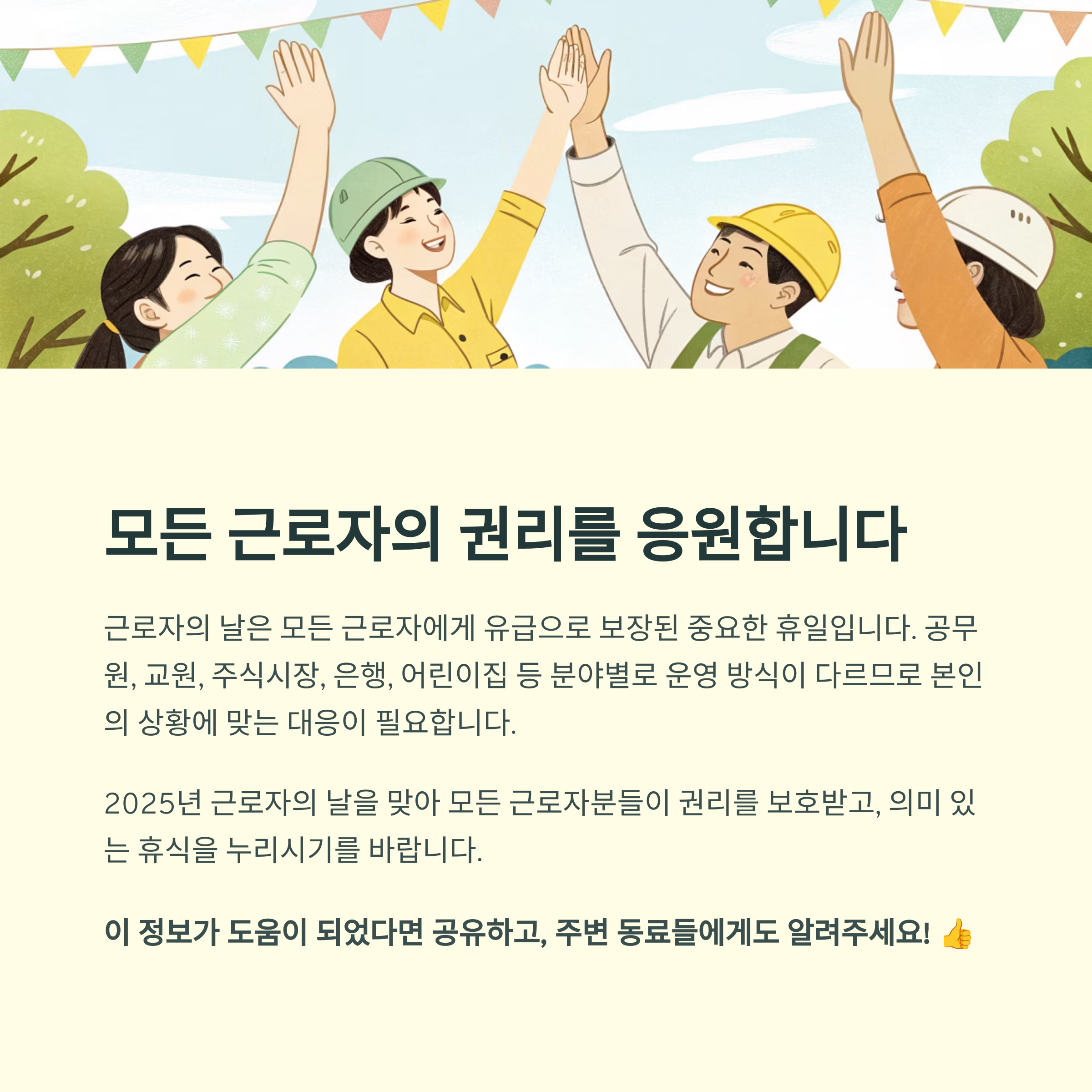 2025년 근로자의 날을 맞아 모든 근로자분들이 권리를 보호받고, 의미 있는 휴식을 누리시기를 바랍니다.