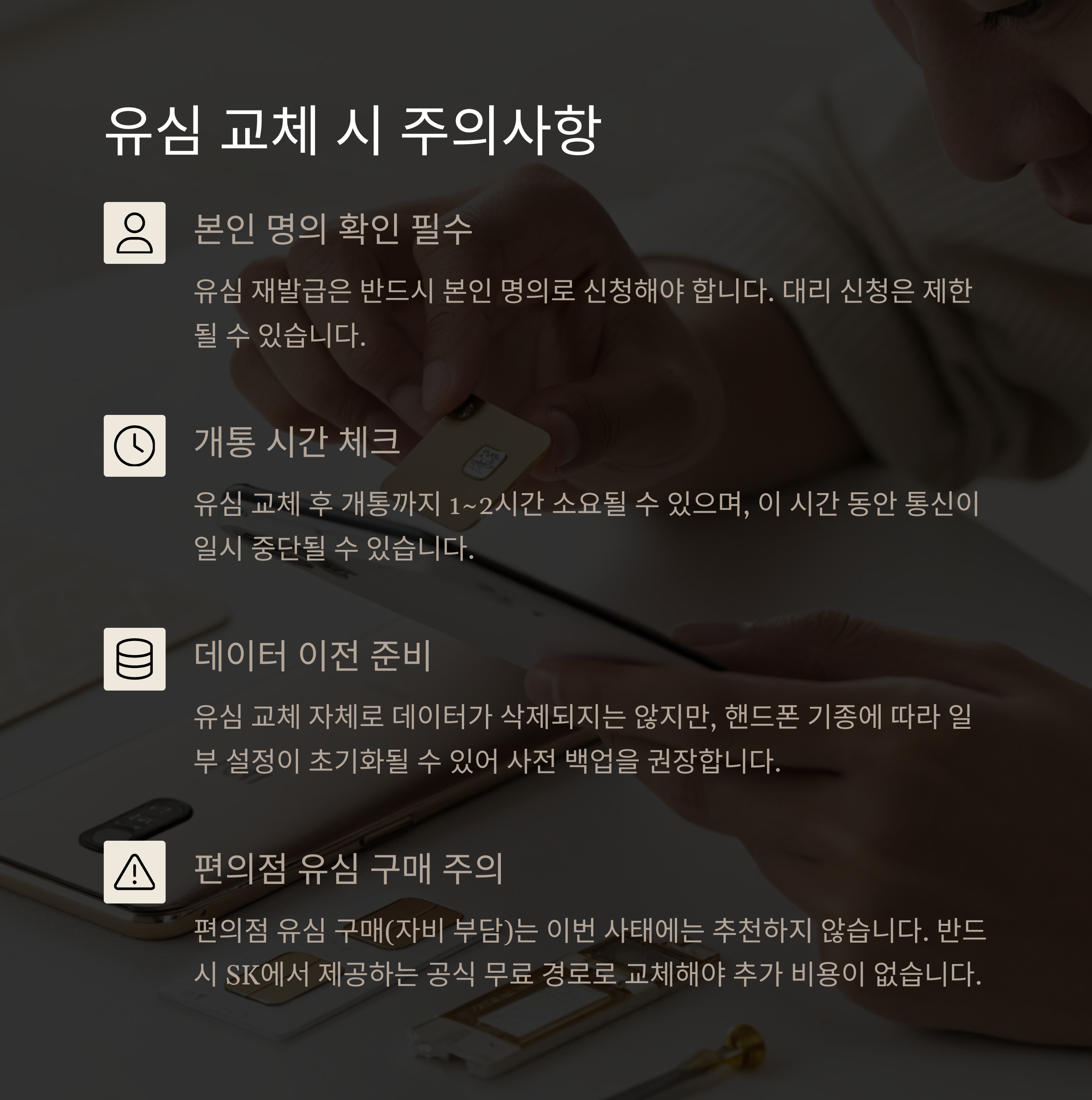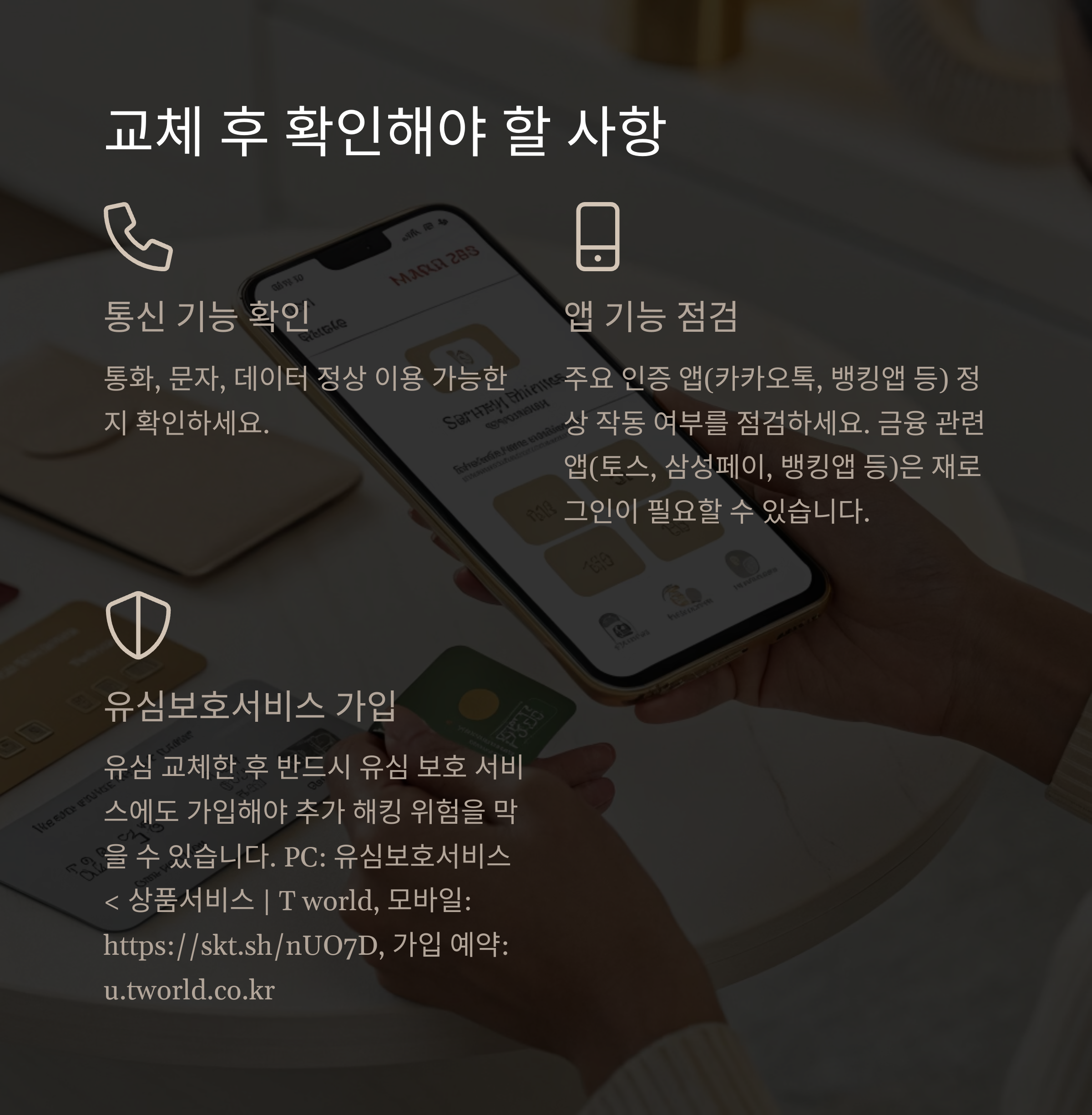 | 준비물 | 새 유심 영수증, 기존 유심, 신분증, 계좌번호 |