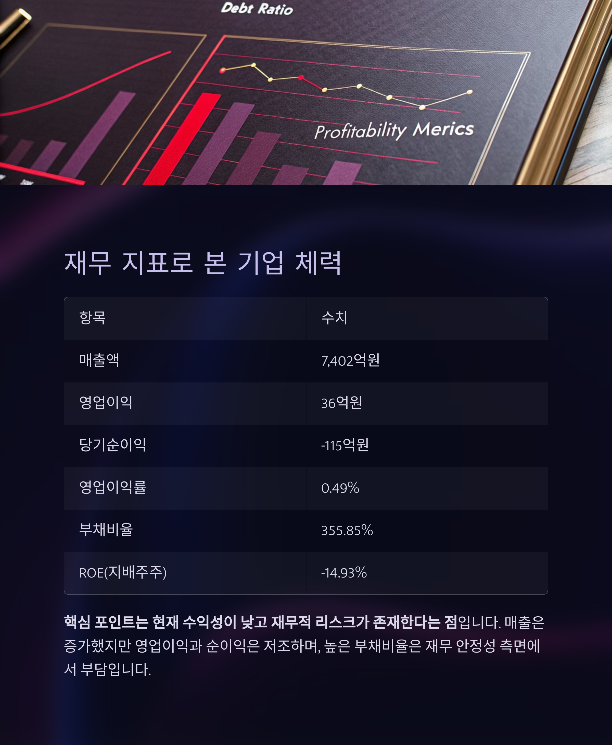 수익성이 낮고 재무적 리스크가 존재한다는 점