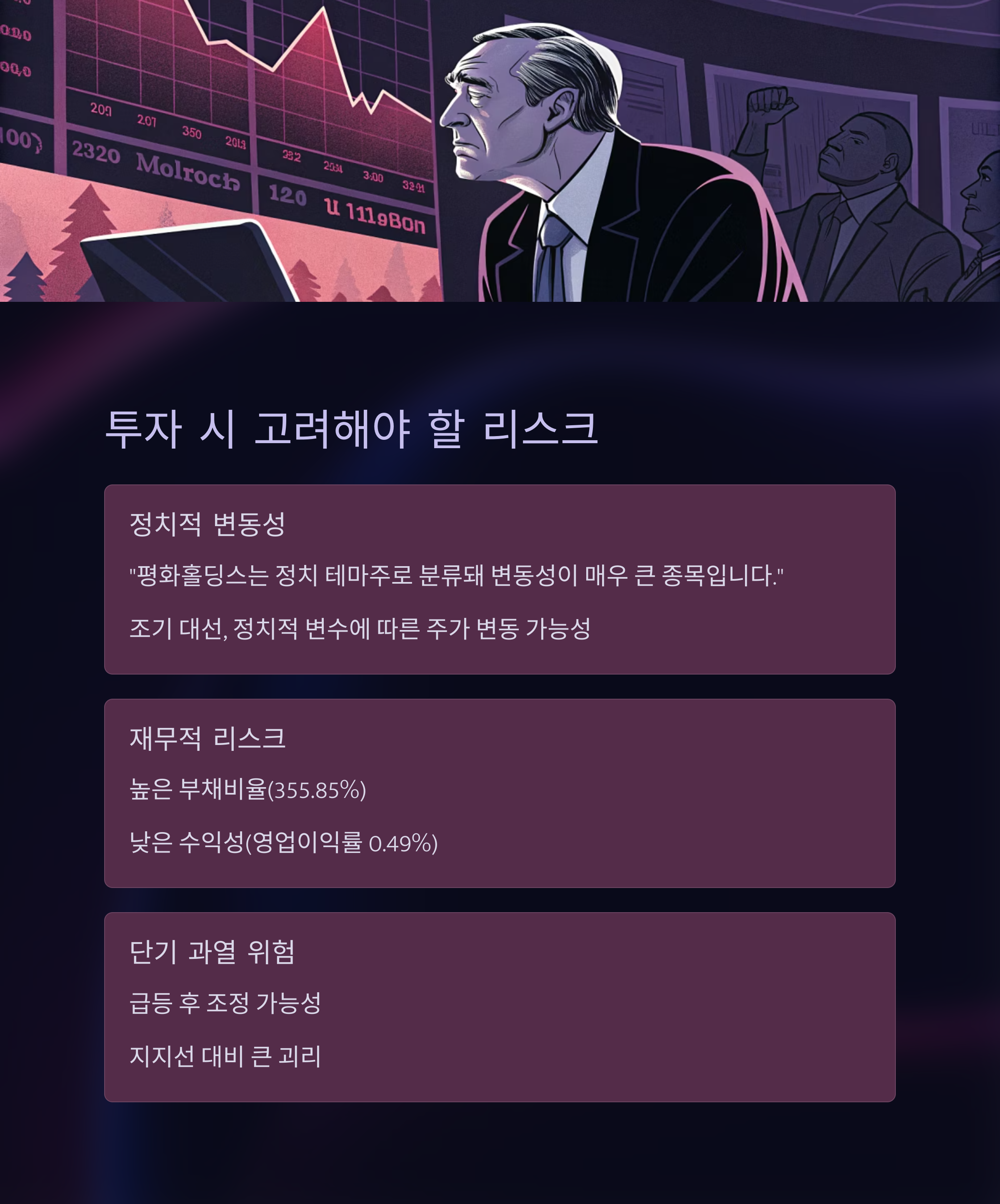 정치 테마주 변동성, 재무 리스크, 단기 과열 위험이라는 리스크 요인