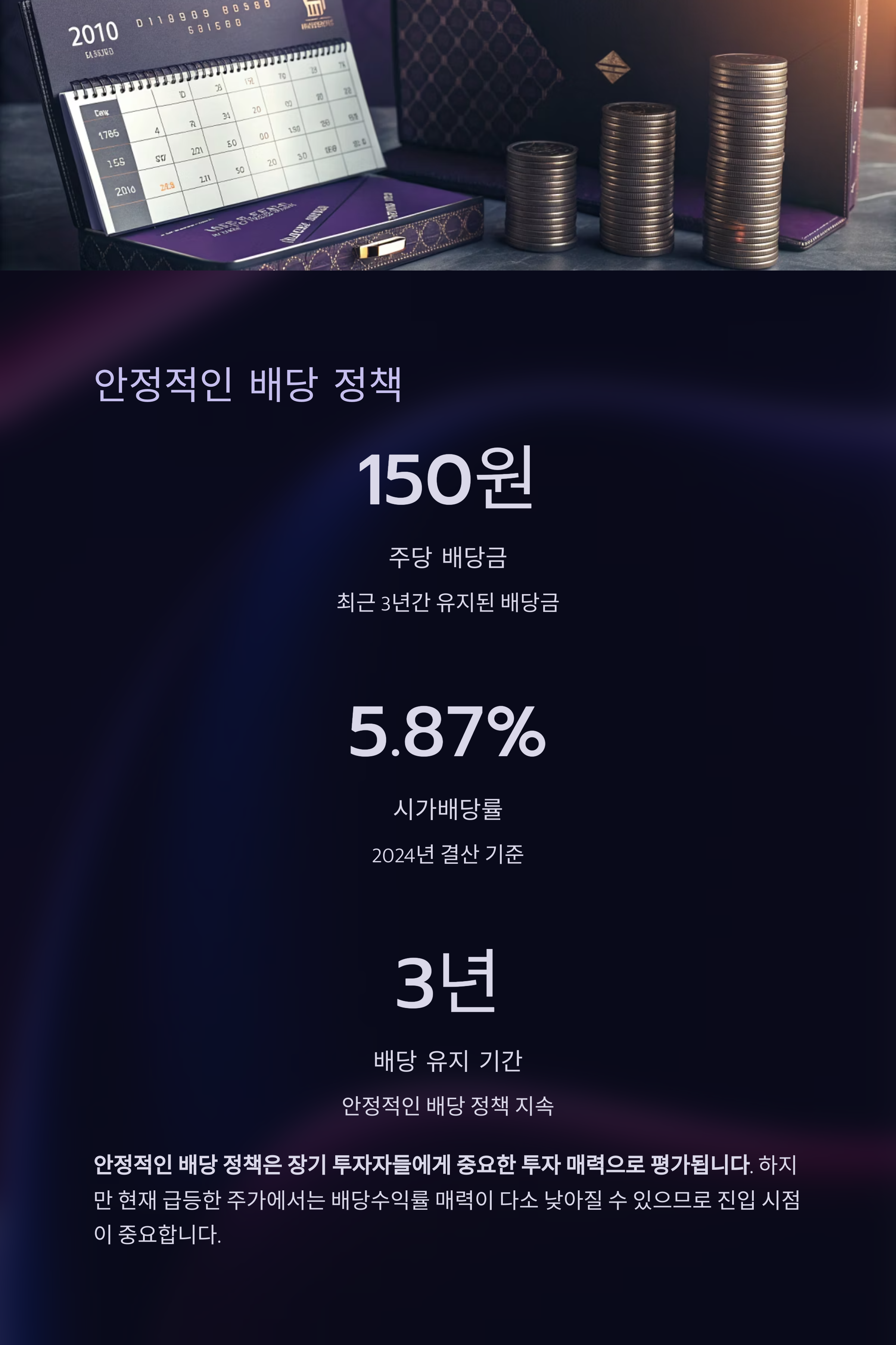 2024년 결산 기준으로도 시가배당률은 약 5.87%로, 안정적인 배당 정책은
