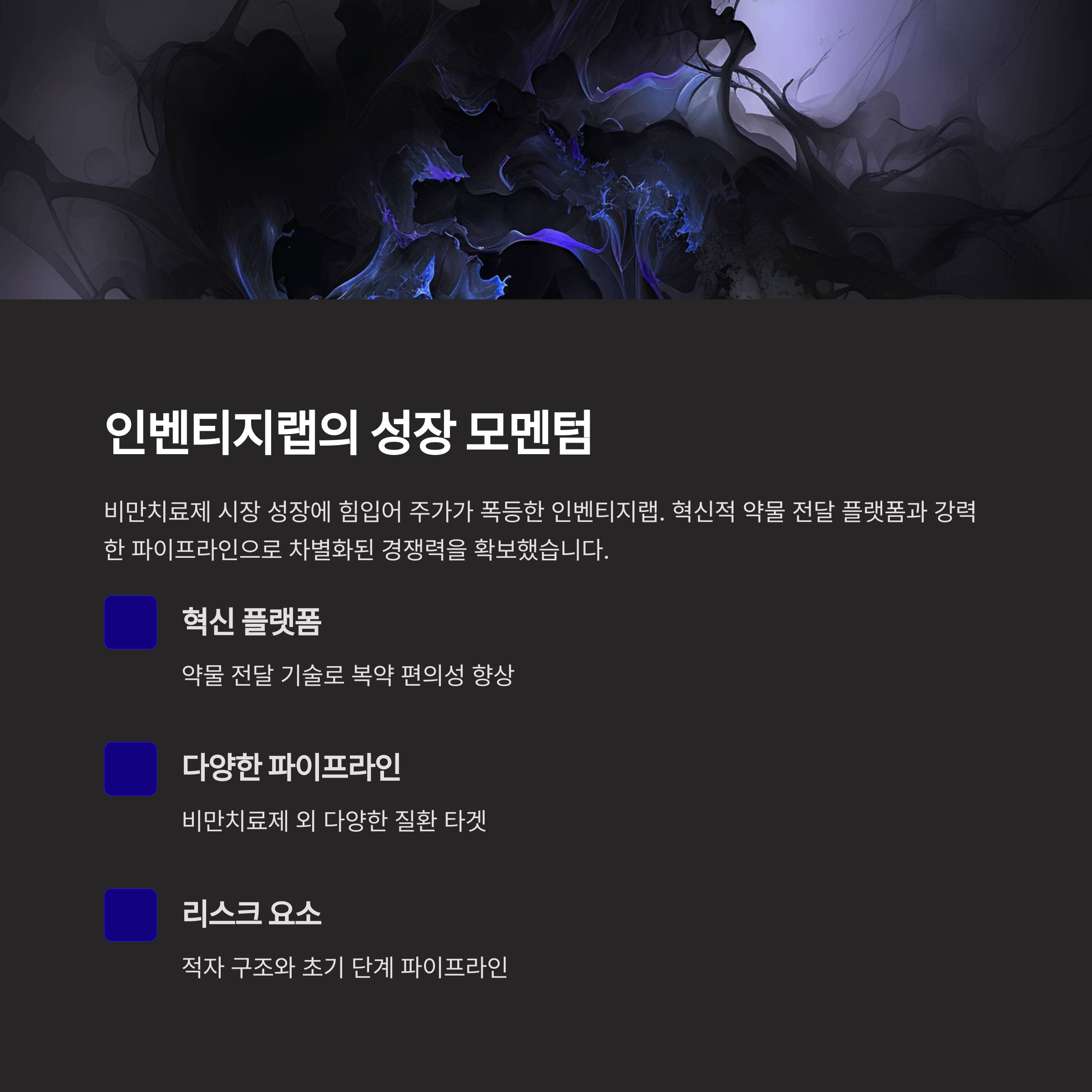 인벤티지랩은 최근 비만치료제 시장의 성장세에 힘입어 주가가 폭등하며 주목받고 있습니다.
