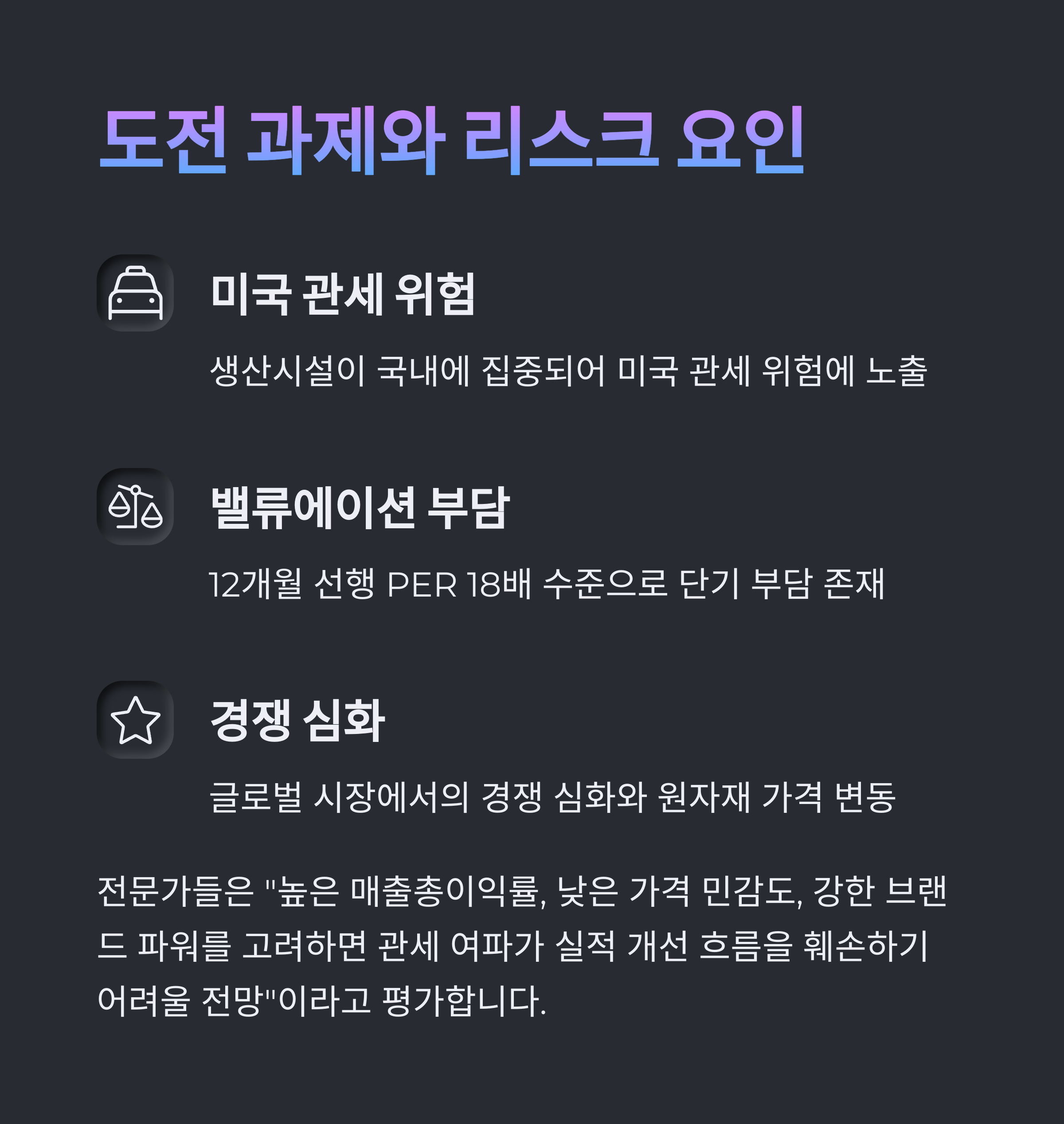 리스크 요인: 관세·환율·밸류 부담은?