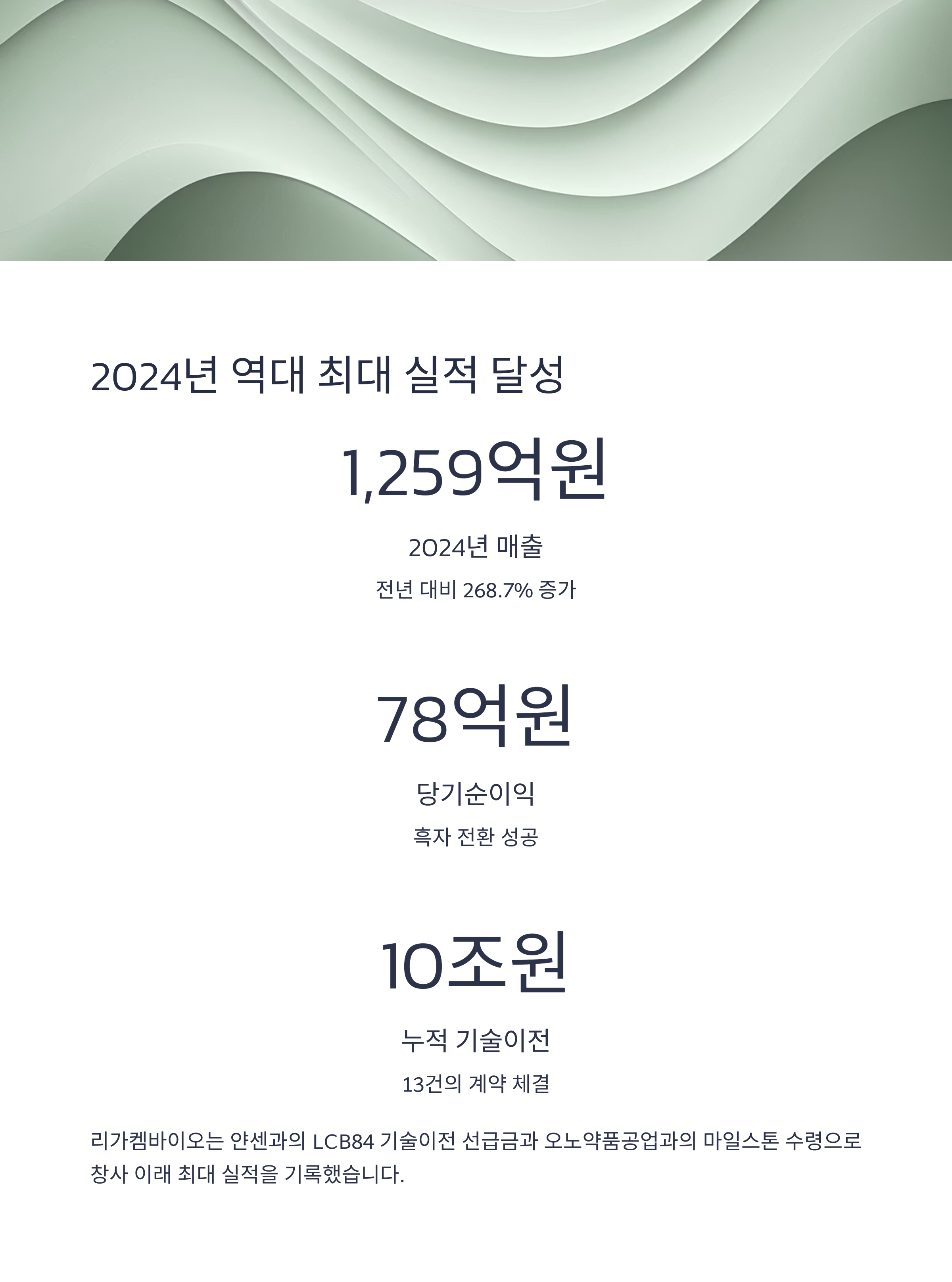 리가켐바이오는 2024년 창사 이래 최대 매출을 달성하며 본격적인 실적 성장 궤도에 진입했습니다.