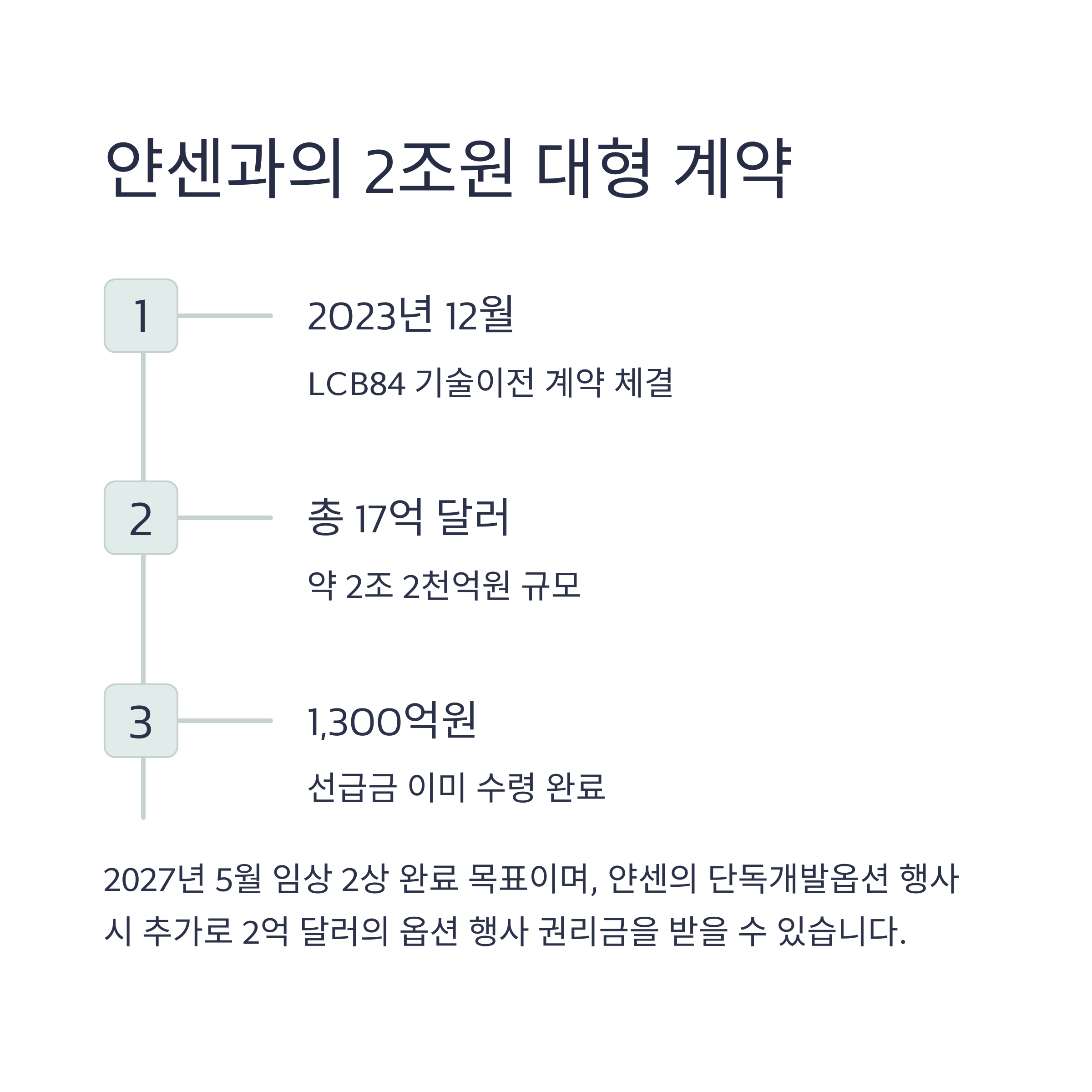 얀센이 단독 개발 옵션을 행사할 경우 추가 2억 달러 수령 가능성도 존재합니다.
