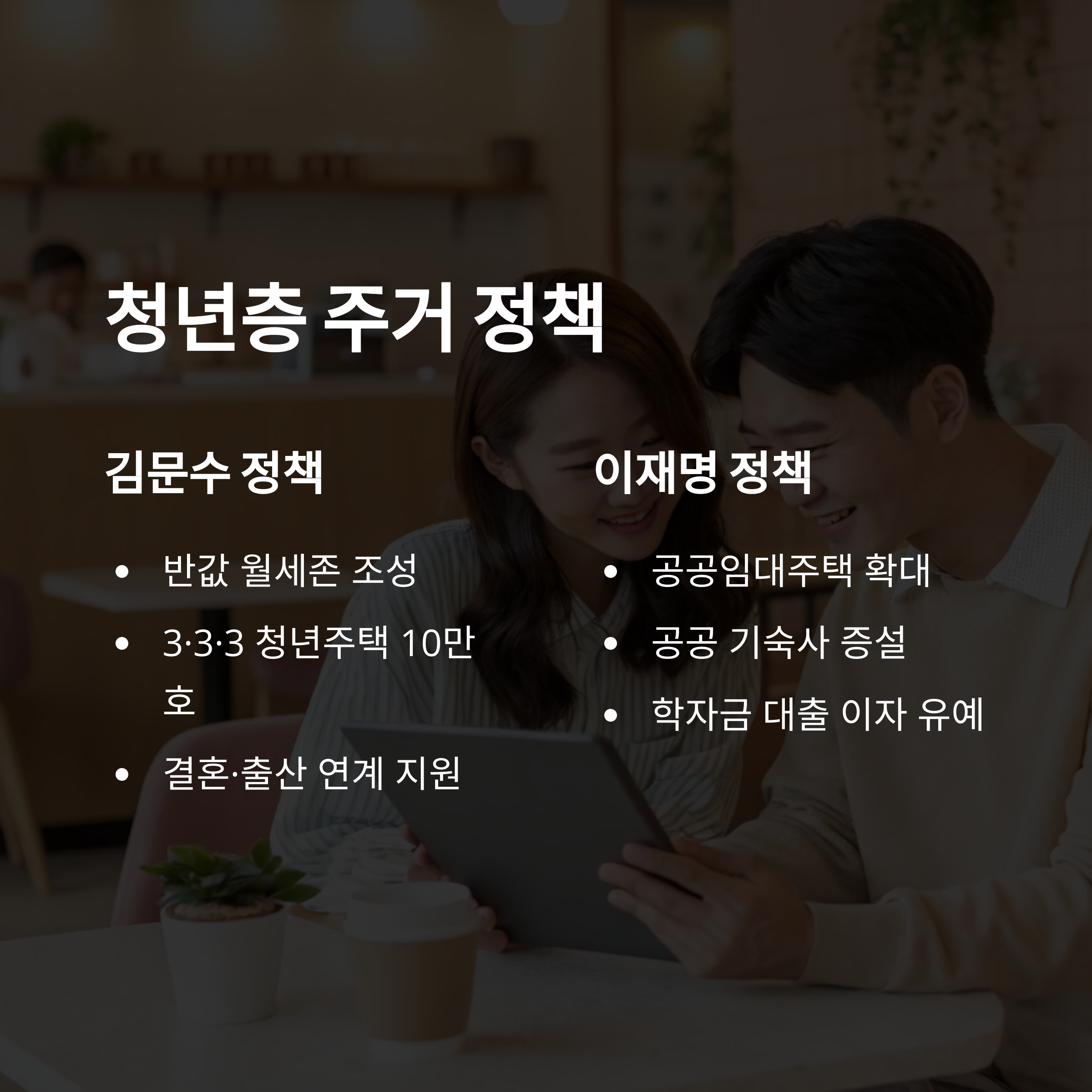 | 이재명 | 공공 기숙사 확대, 임대주택 강화 | 유휴 부지 활용한 공공공급 |