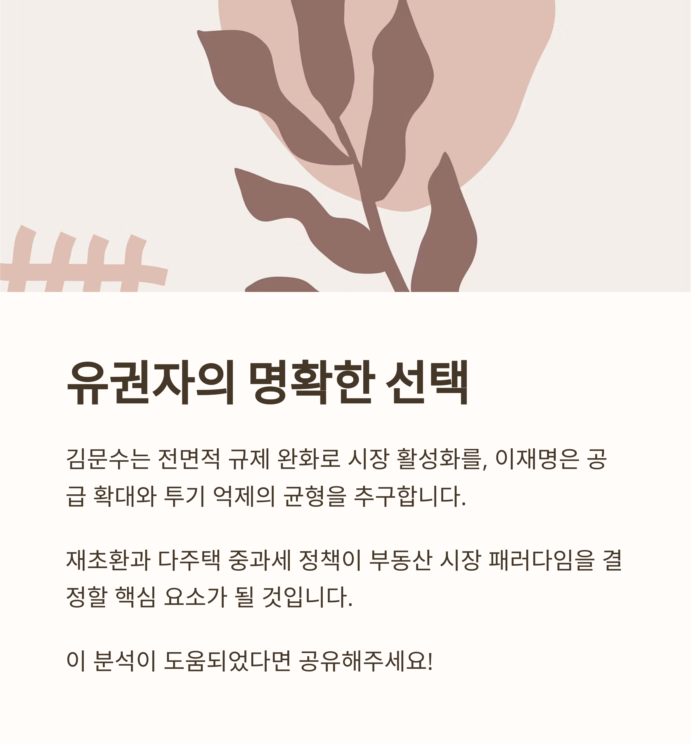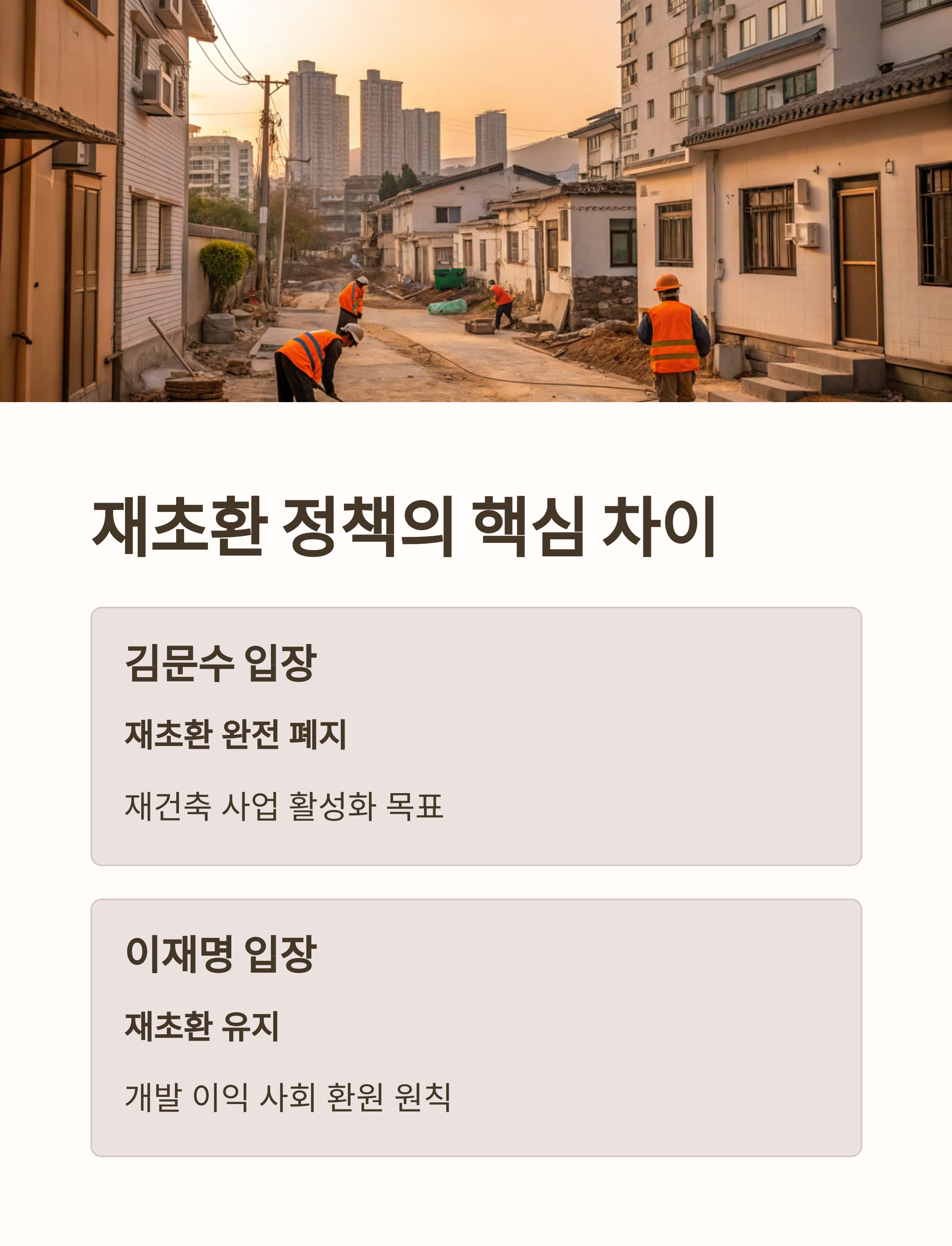 "김문수 후보의 정책이 실행되면 단기적으로 재건축 시장에 활력이 생기고, 지방 시장도 활성화될 수 있습니다. 반면, 이재명 후보의 전략은 공공 재원을 활용한 안정적 공급을 통해 중장기적으로 실수요자의 주거 안정을 도모할 수 있는 모델입니다."