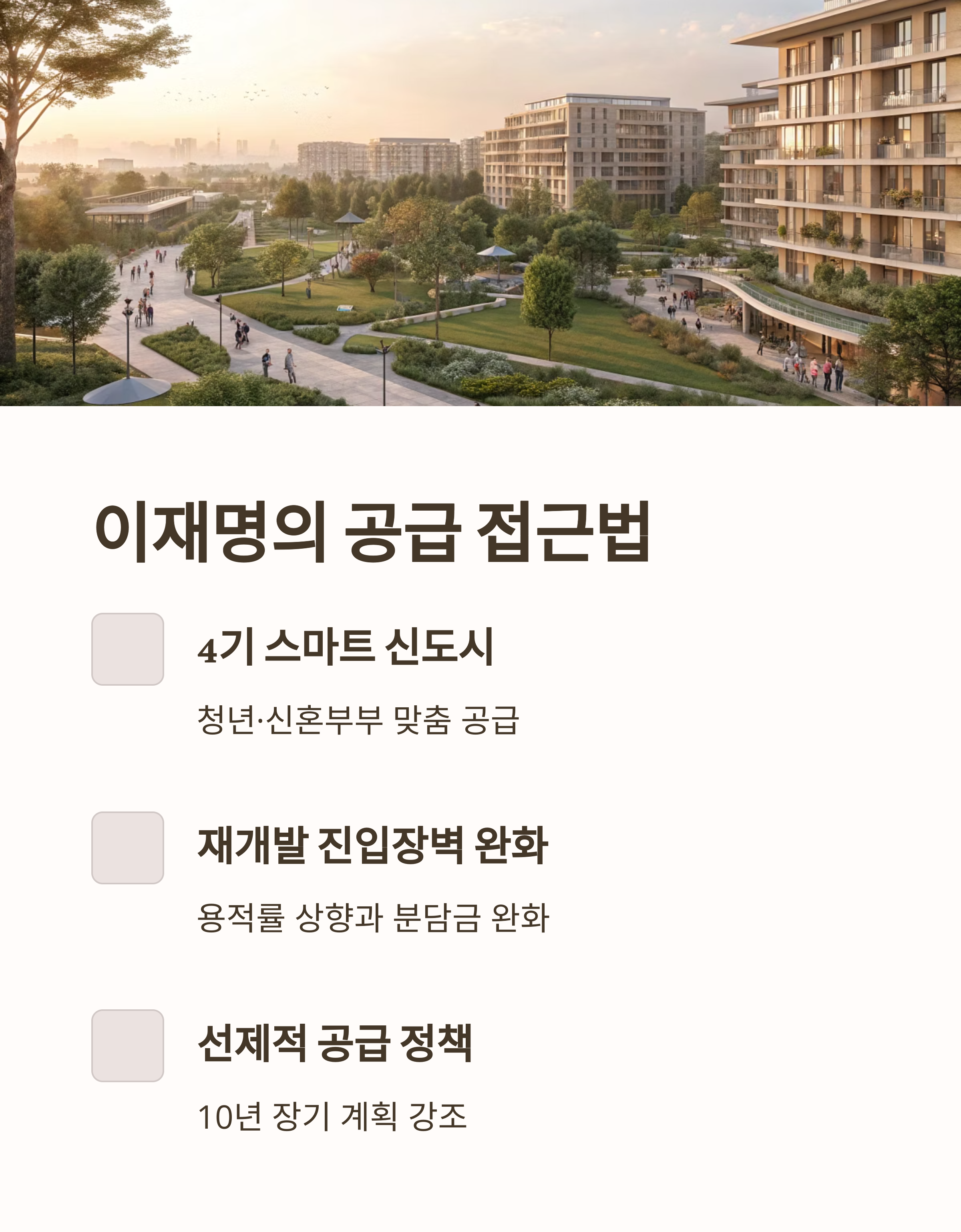 이재명 후보는 4기 신도시 개발을 통해 청년과 무주택자에게 공공주택을 공급하며, 재초환 유지 및 종부세 조정을 통해 개발 이익의 사회 환원을 강조합니다.