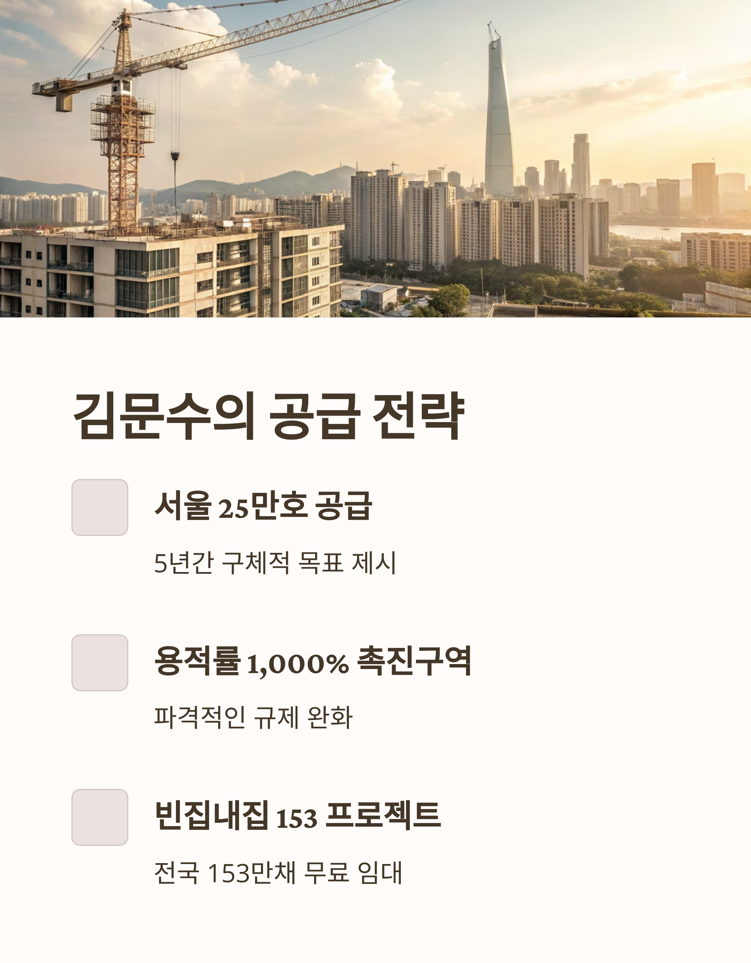 서울 25만호 공급, 재초환 폐지, 다주택 중과세 철폐 등은 김문수 후보의 핵심 전략입니다. 재건축과 재개발을 가로막는 규제를 없애고, 민간의 역할을 대폭 확대하겠다는 입장입니다.