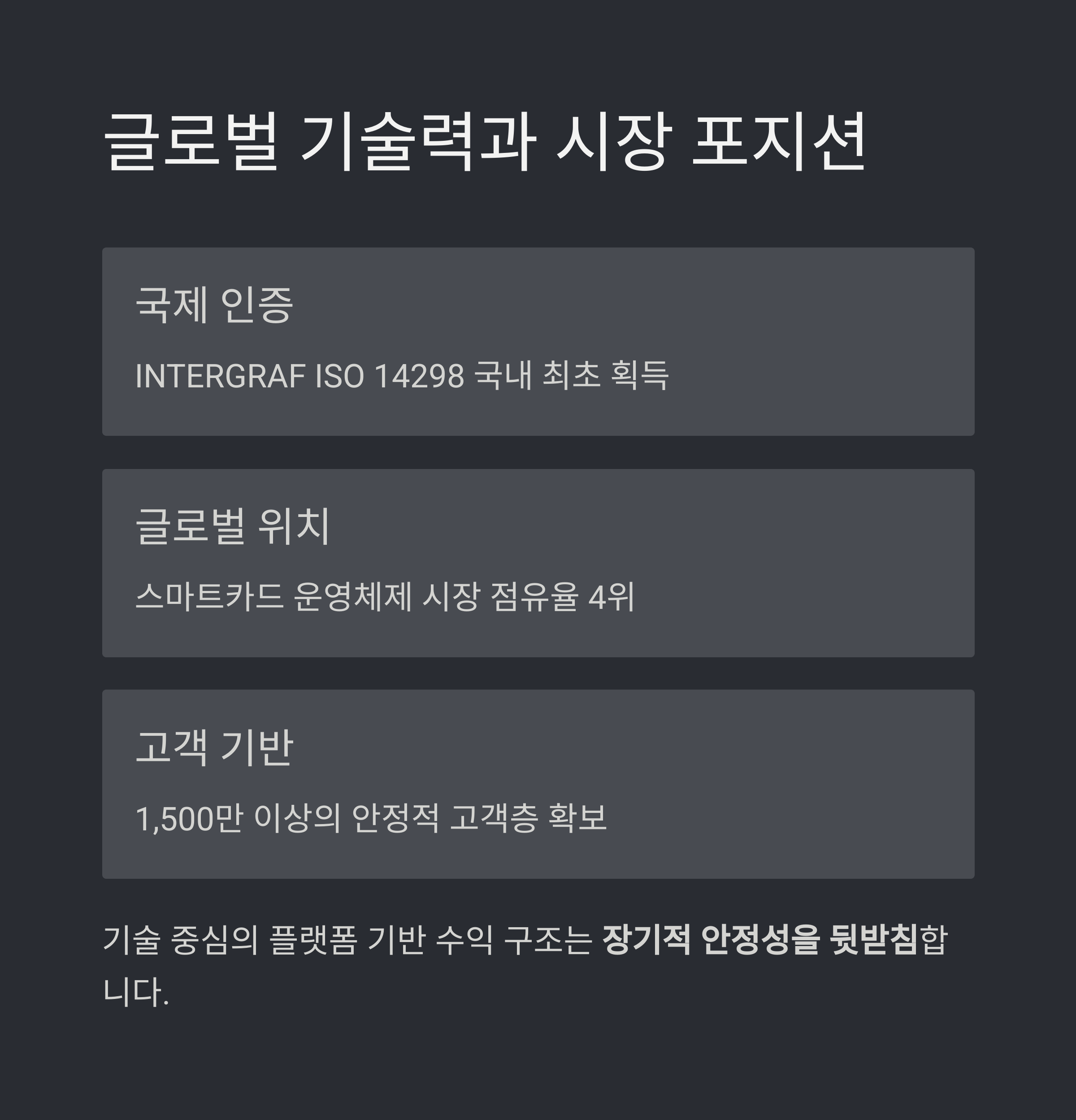 | 스마트카드 OS | 있음 | 글로벌 4위 |