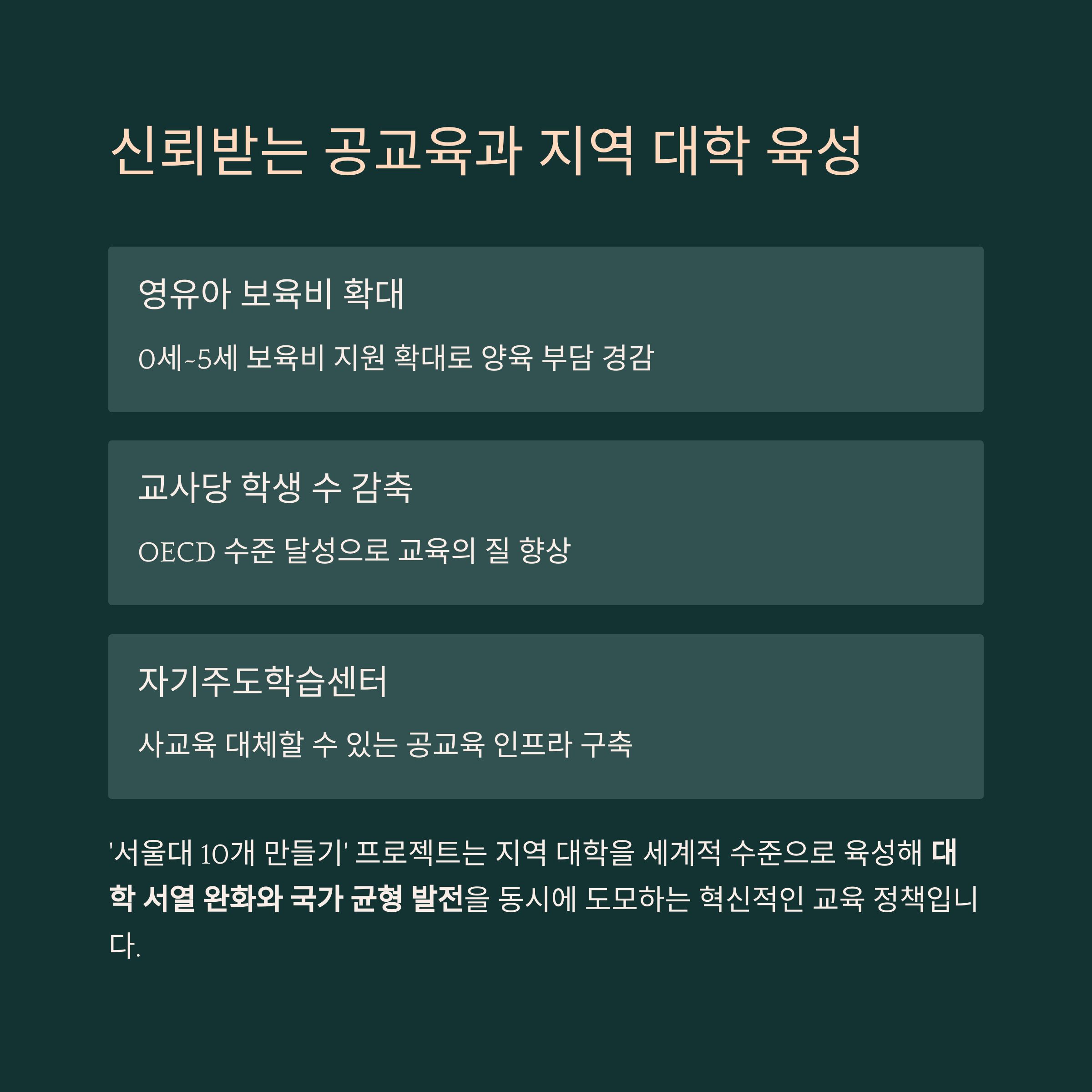 0세~5세 보육비 확대, 교사당 학생 수 OECD 수준 달성, 자기주도학습센터 설립 등