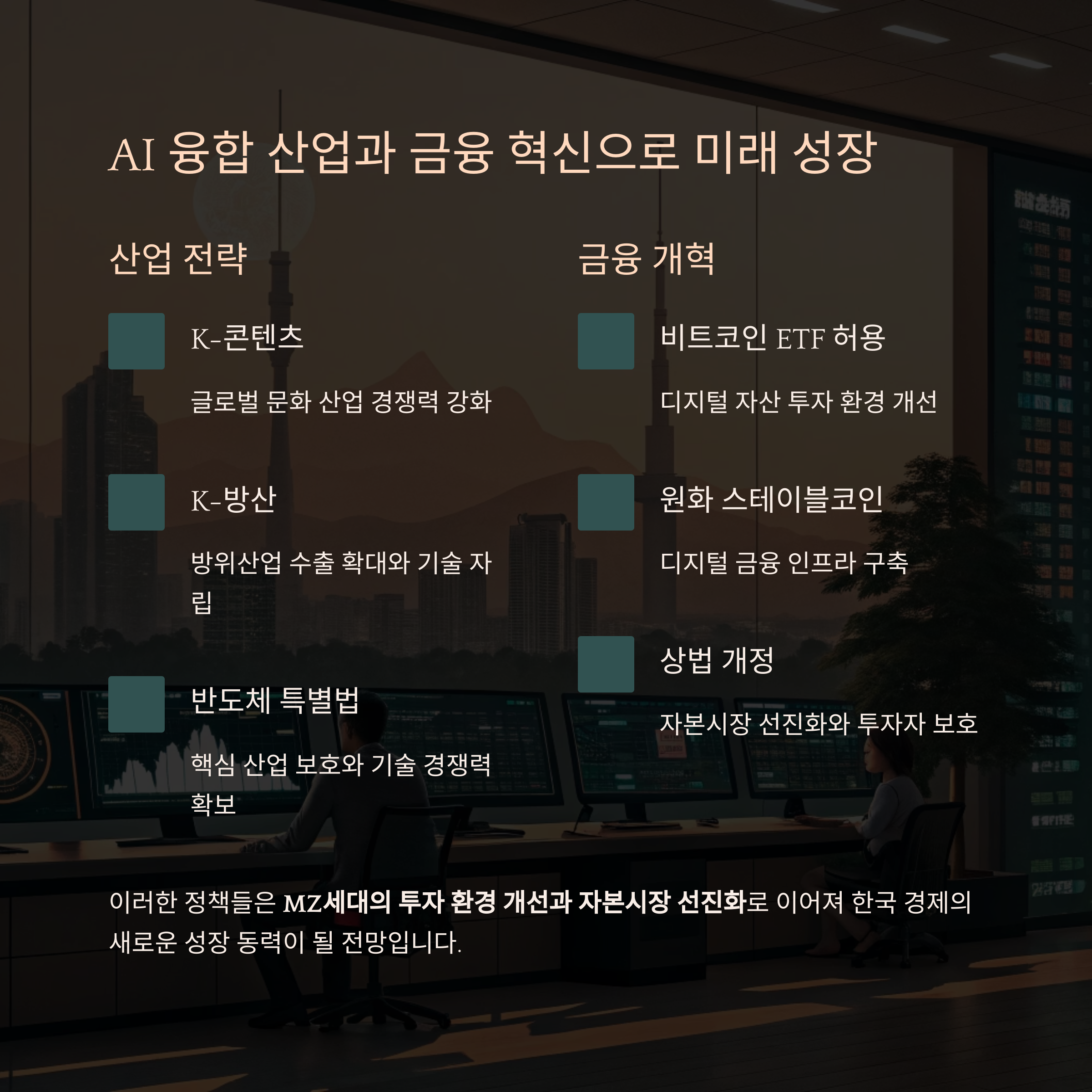 금융 개혁으로는 비트코인 ETF 허용, 원화 스테이블코인 발행, 상법 개정 등이 추진되며,