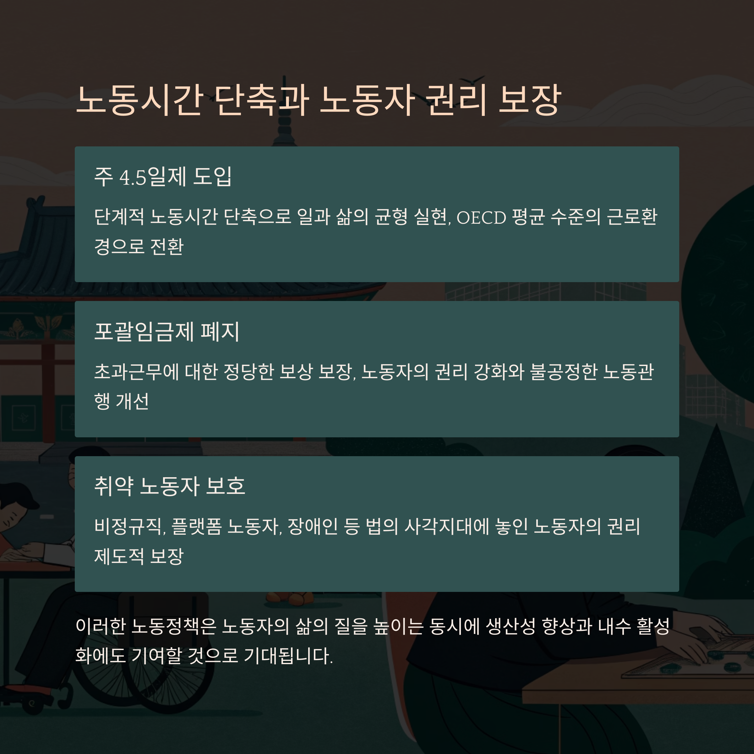 노동정책은 주 4.5일제 도입과 포괄임금제 폐지가 핵심입니다.