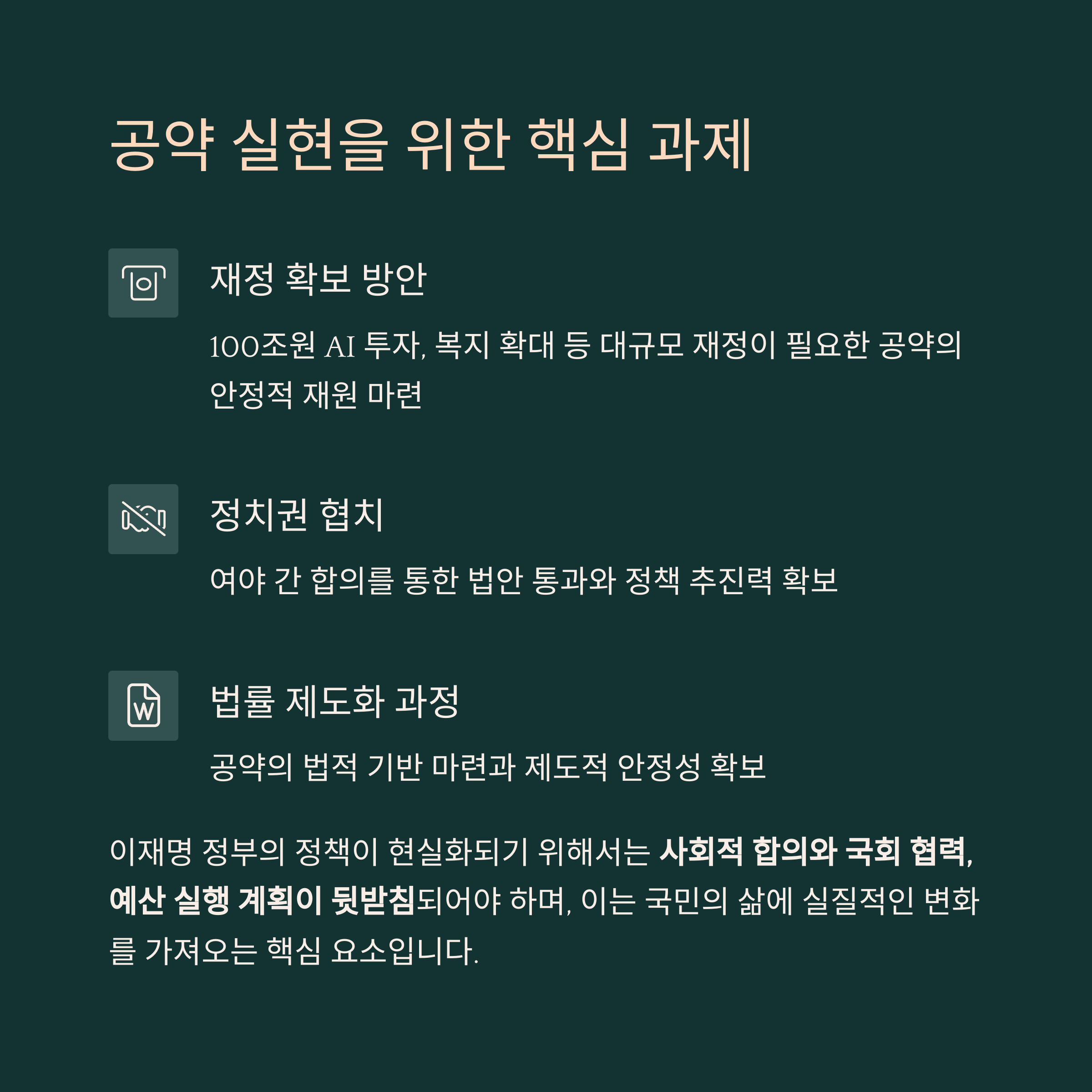 현실화되기 위해서는 사회적 합의와 국회 협력, 예산 실행 계획이 뒷받침되어야 합니다.