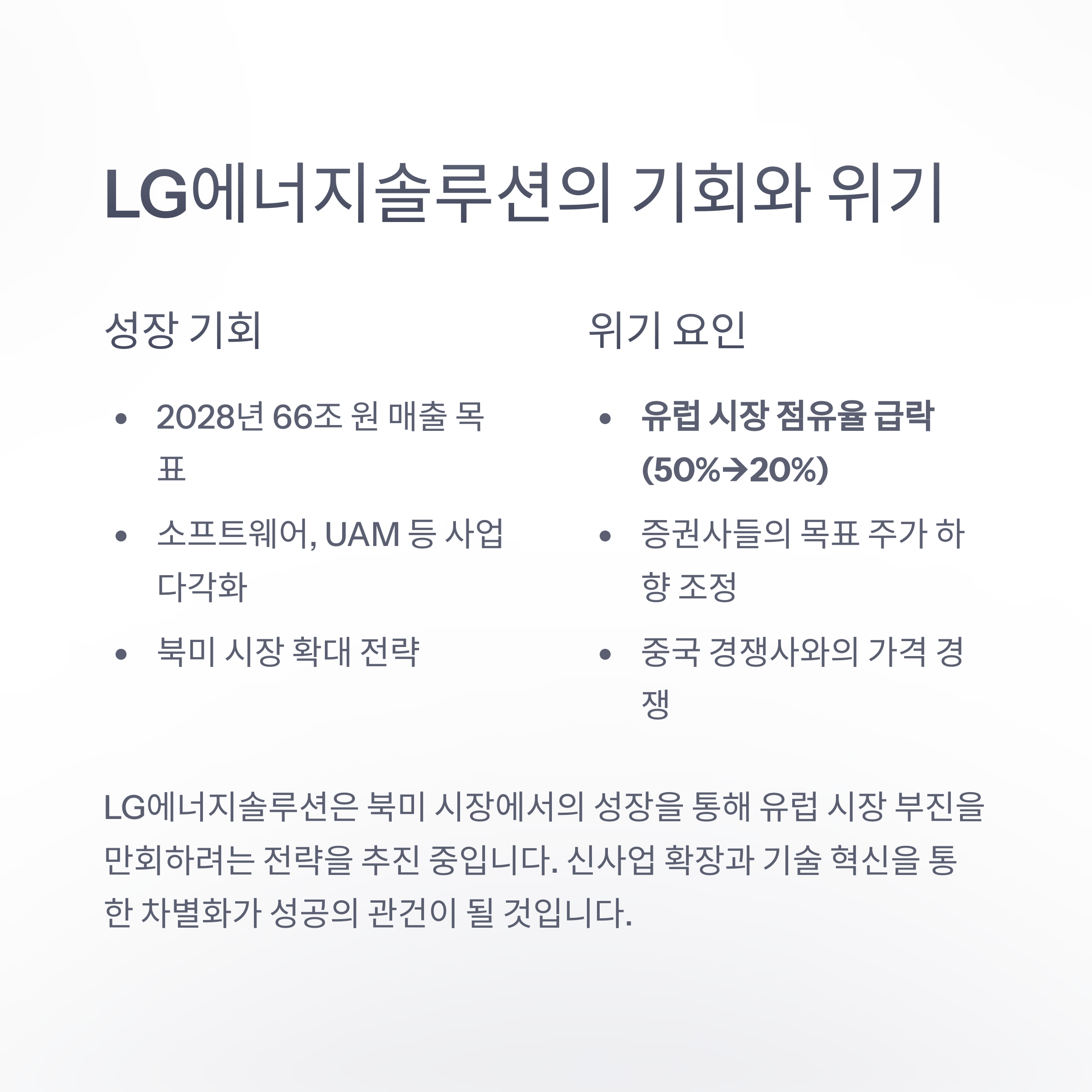 그러나 중국의 가격 공세, 미국 IRA 정책의 불확실성, 유럽 시장 점유율 하락 등