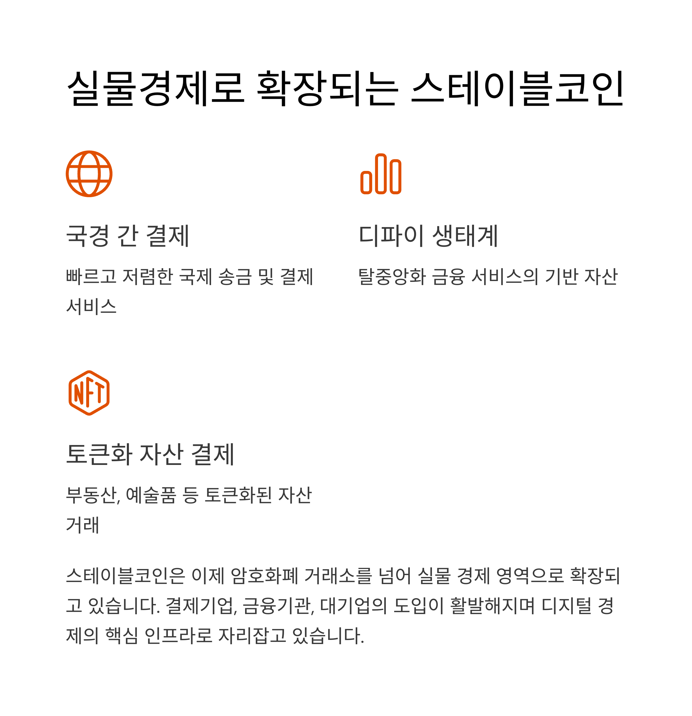 특히 국경 간 결제, 디파이 생태계, 토큰화 자산 결제에 활용되며