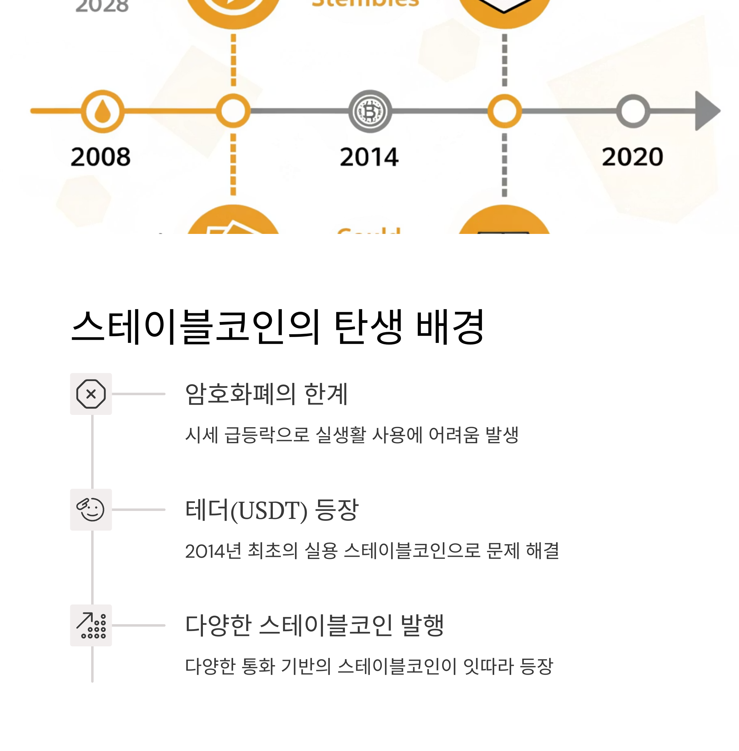 2014년 테더(USDT)가 이 문제를 해결하며 최초의 실용 스테이블코인으로 등장했고,