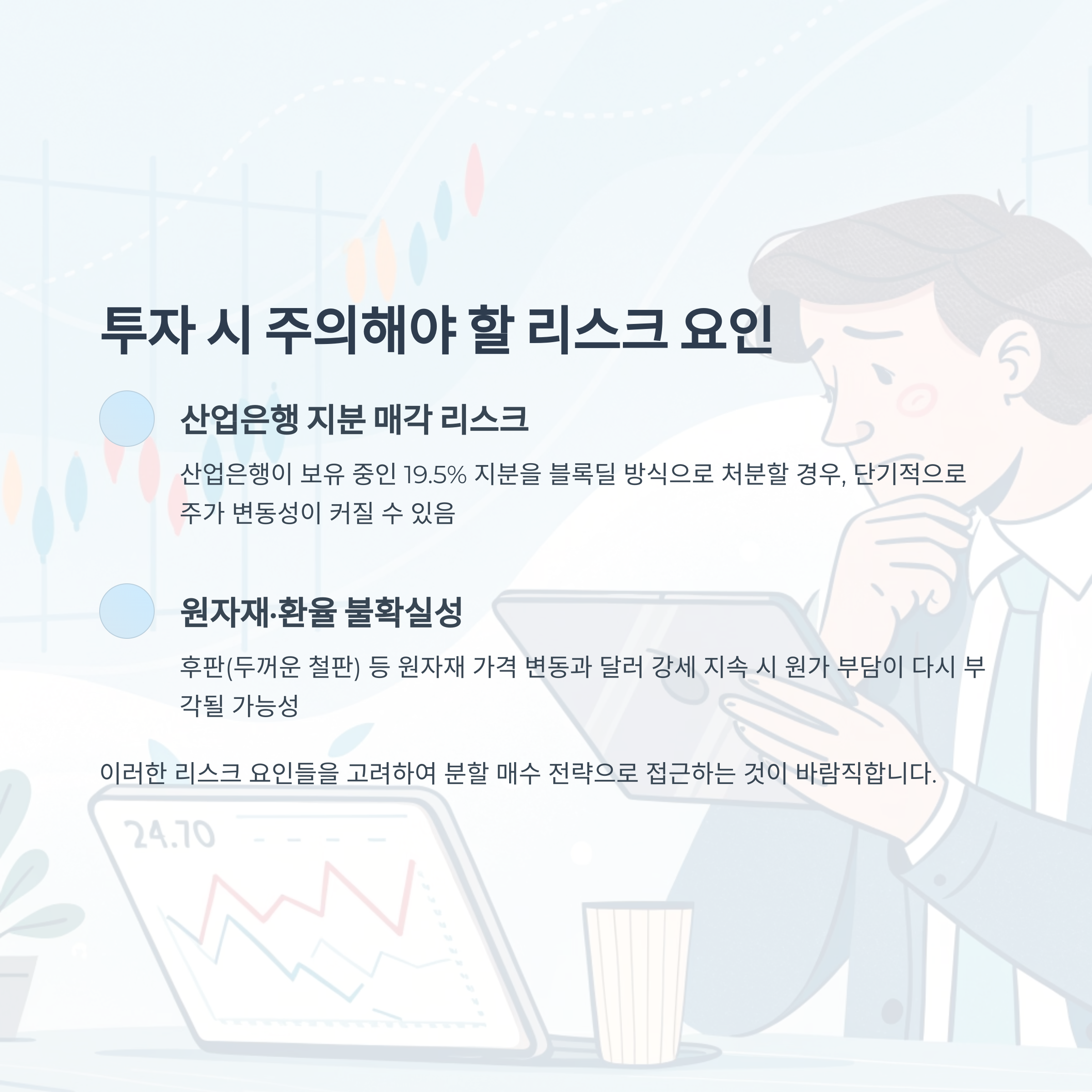 다만 산업은행 지분 매각과 환율·원자재 변수는 단기 변동성을 유발할 수 있으므로, 분할 매수와 철저한 리스크 관리로 접근하는 것이 바람직합니다.