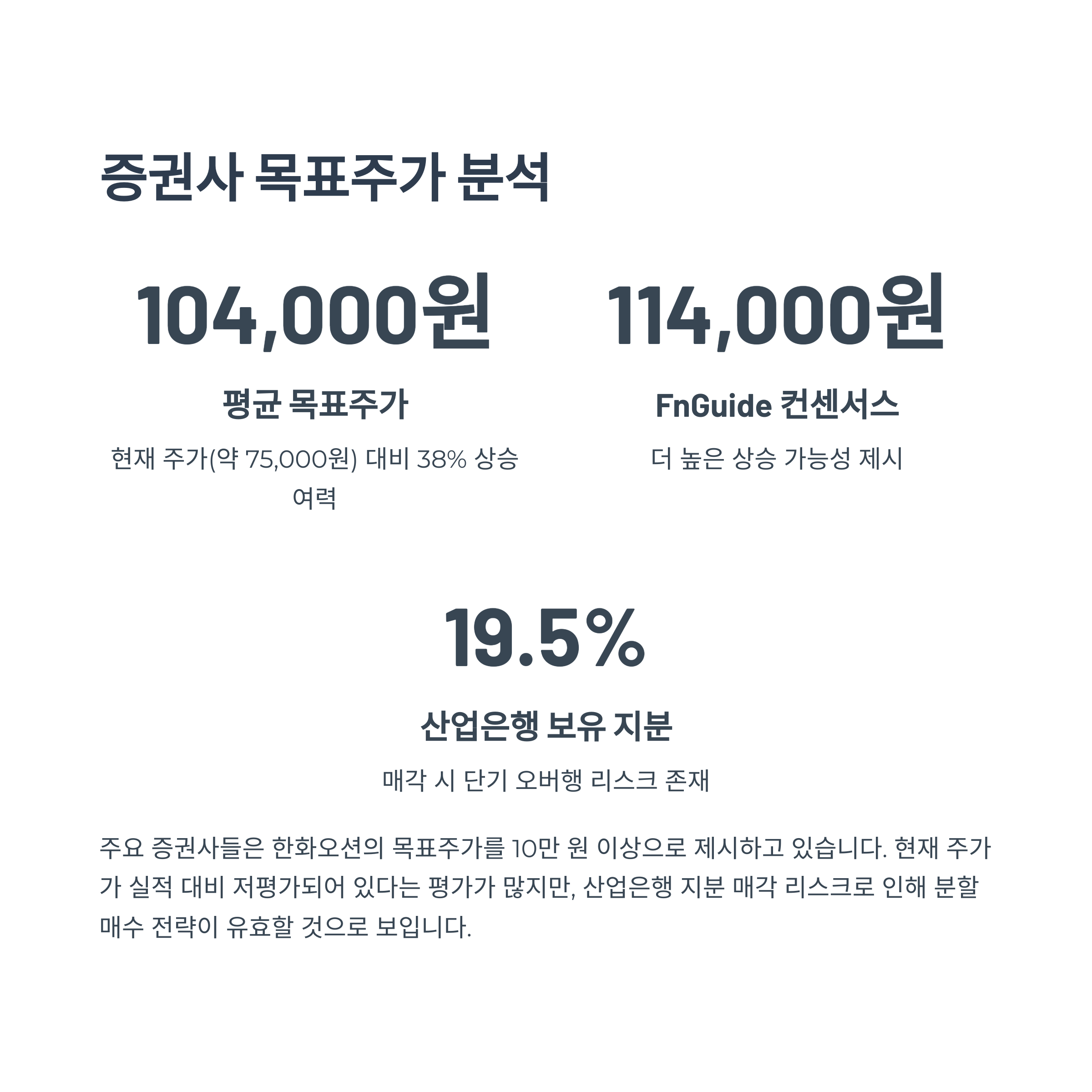 현재 주가가 실적 대비 저평가 구간에 있다는 평가가 많지만, 단기적으로는 산업은행 보유 지분(19.5%) 매각 리스크가 존재하기 때문에 분할 매수 전략이 유효할 것으로 보입니다.