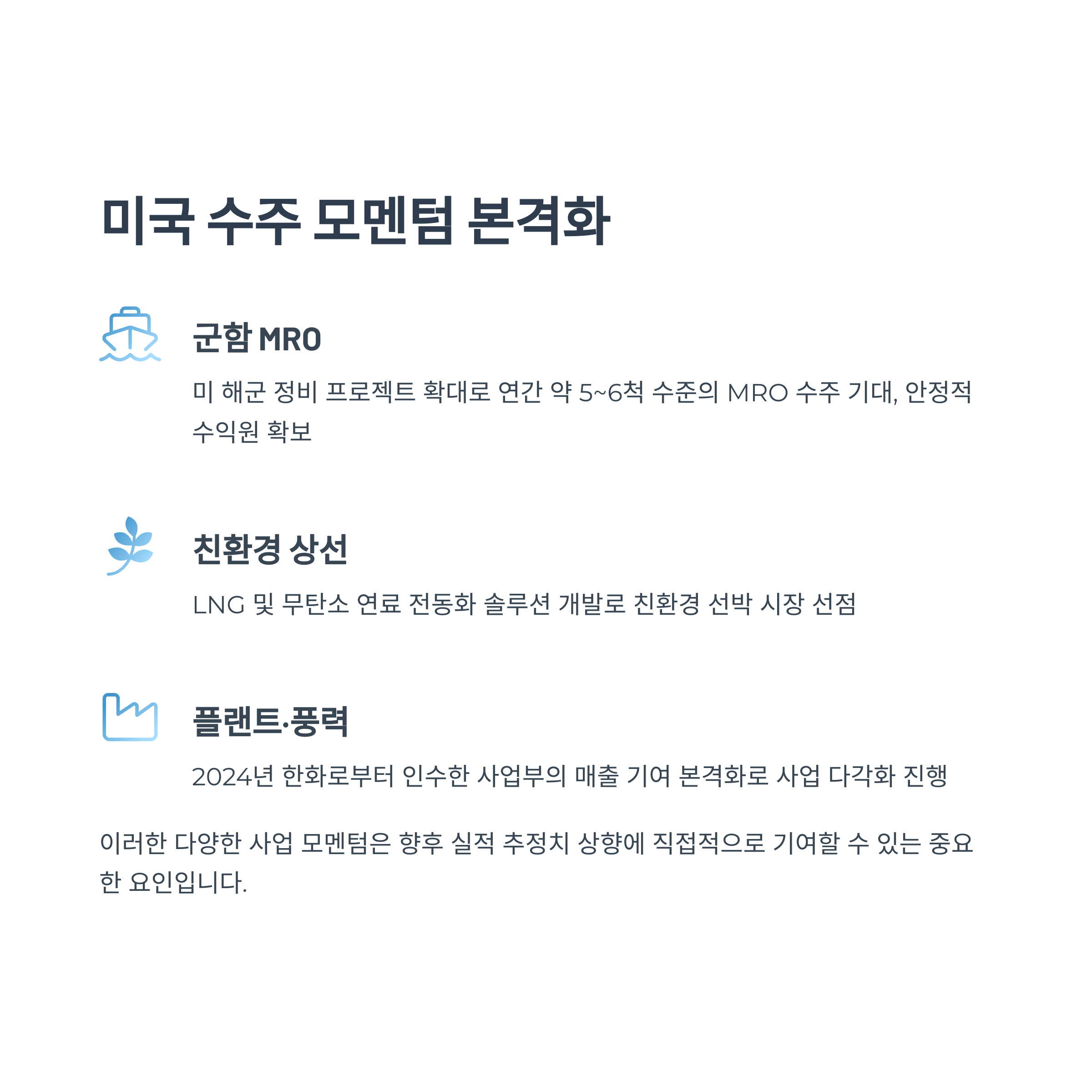 | 군함 MRO | 미 해군 정비 프로젝트 확대, 안정적 수익원 |