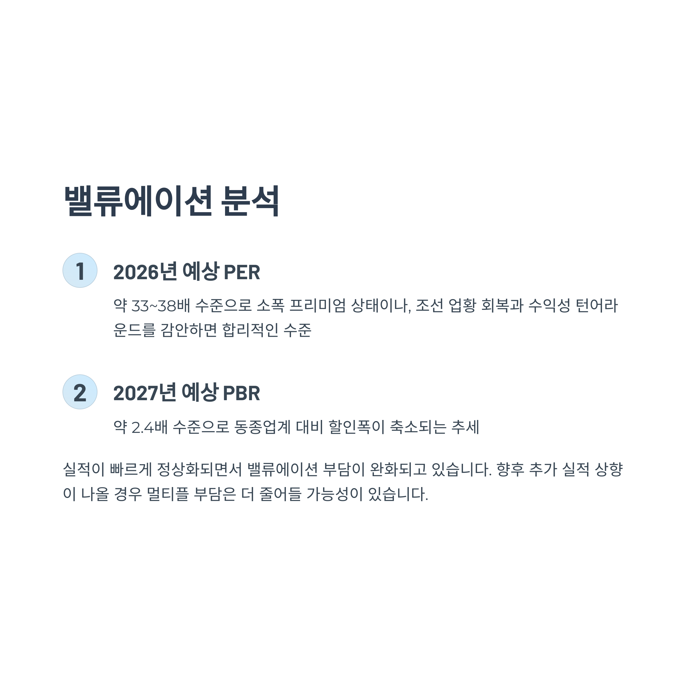 실적이 빠르게 정상화되면서 PBR도 동종업계 대비 과도한 프리미엄에서 벗어나고 있습니다. 향후 추가 실적 상향이 나올 경우 멀티플 부담은 더 완화될 가능성이 있습니다.
