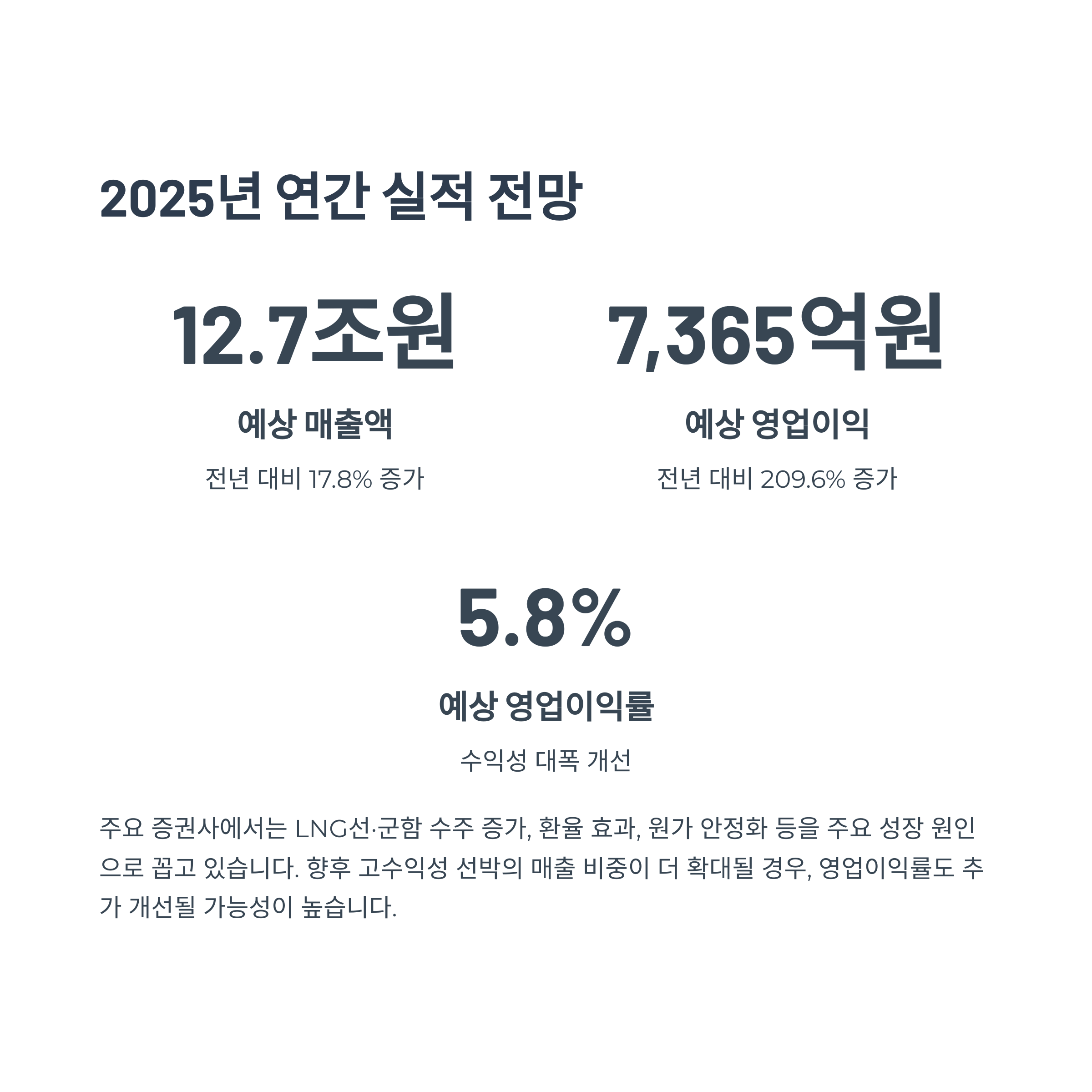 2025년 연간으로도 영업이익 7,365억 원이 전망되며 전년 대비 무려 209% 성장이 예상됩니다. 주요 증권사에서는 LNG선·군함 수주 증가, 환율 효과, 원가 안정화 등을 주요 원인으로 꼽고 있습니다.