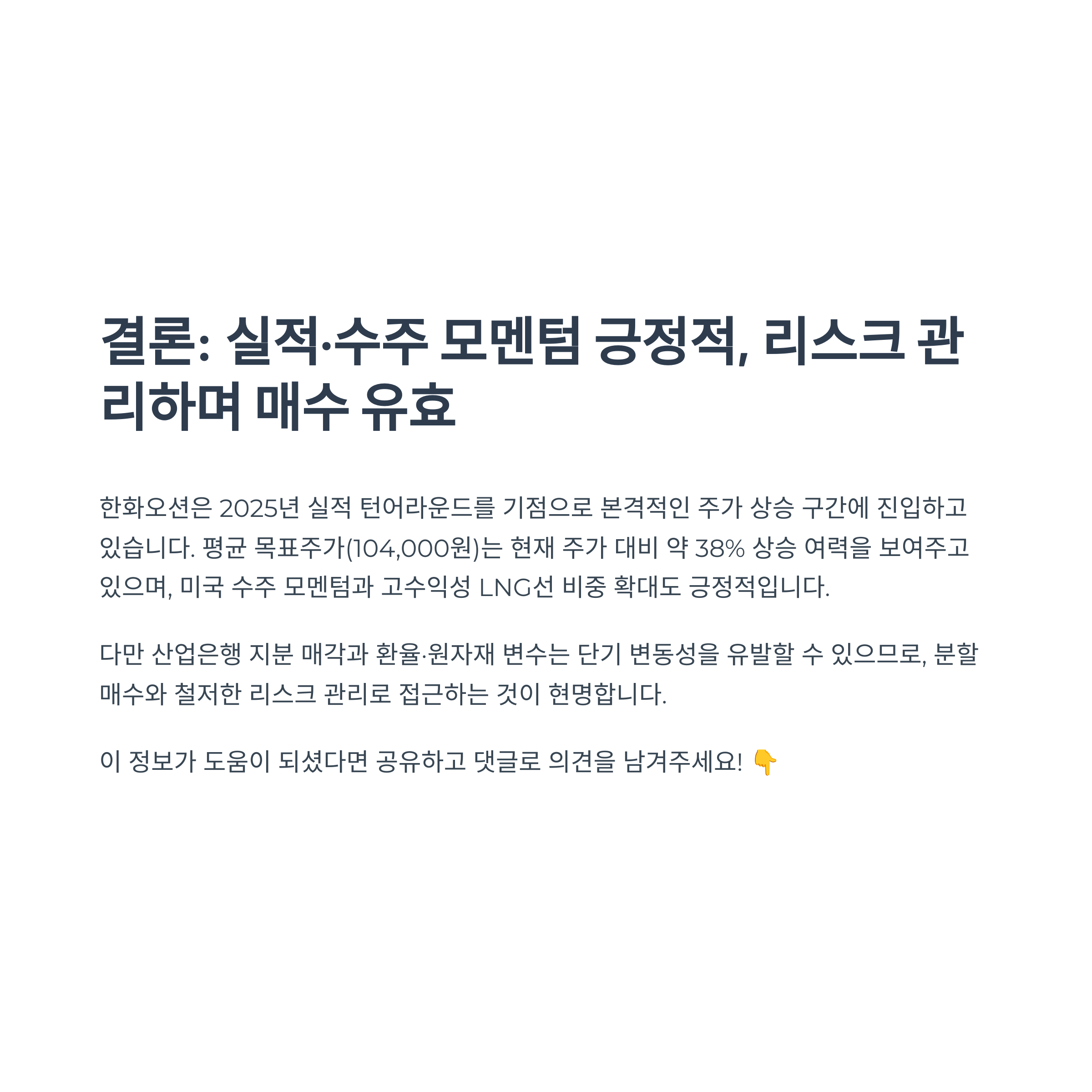 한화오션은 2025년 실적 턴어라운드를 기점으로 본격적인 주가 상승 구간에 진입하고 있습니다. 평균 목표주가(104,000원) 대비 약 30~40% 상승 여력이 남아 있고, 미국 수주 모멘텀과 고수익성 LNG선 비중 확대도 긍정적입니다.