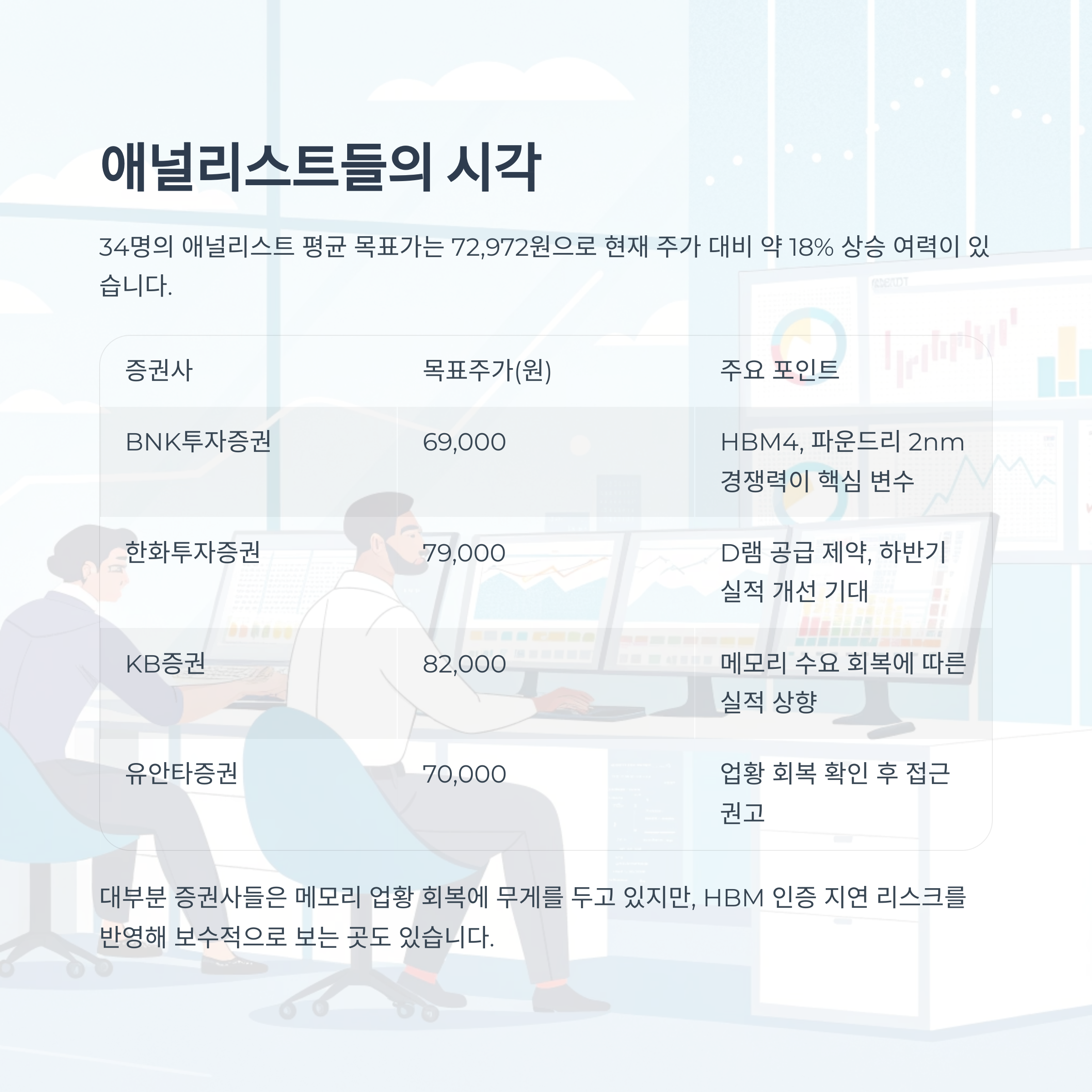 대부분 증권사들은 메모리 업황 회복에 무게를 두고 있지만, HBM 인증 지연 리스크를 반영해 보수적으로 보는 곳도 있습니다.