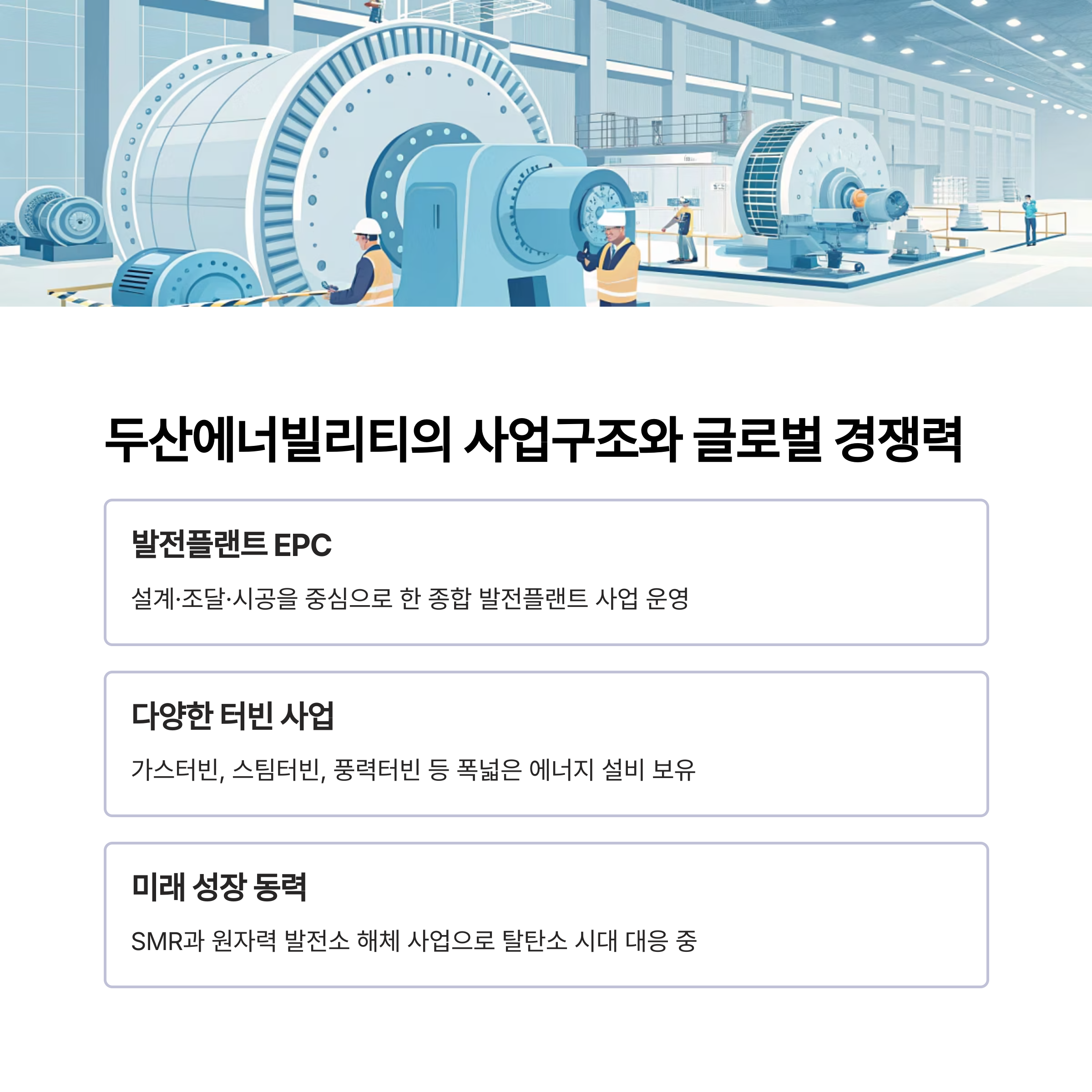 두산에너빌리티(034020)는 에너지·플랜트 EPC, 원자력·SMR(소형모듈원전)과 풍력·수처리 설비를 주축으로 하는 글로벌 발전설비 강자입니다.