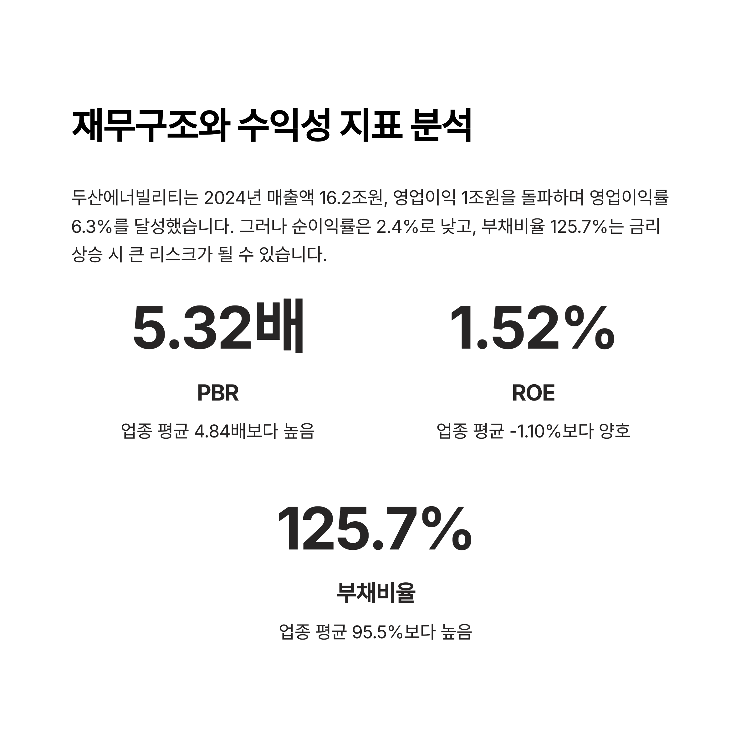 부채비율 125.7%는 금리 상승 시 이자 부담 리스크를 크게 키울 수 있는 구조입니다.