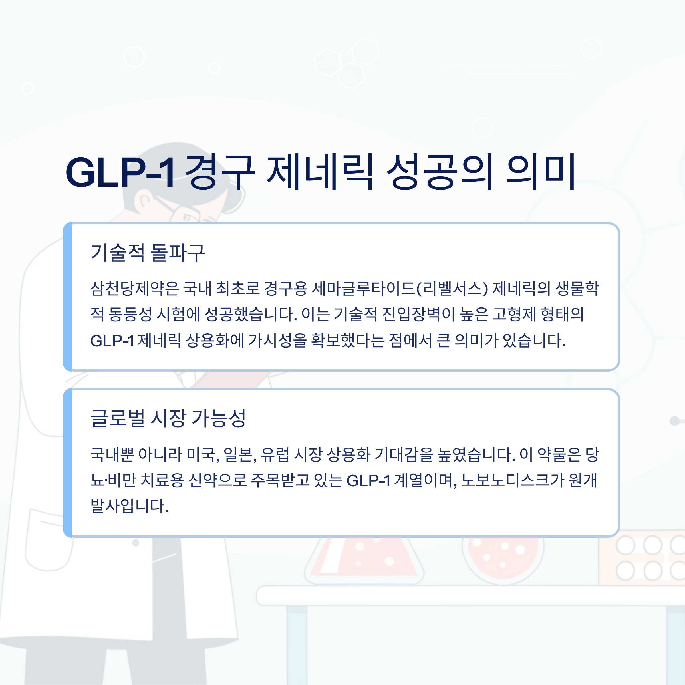 이 시험 성공은 기술적 진입장벽이 높은 고형제 형태의 GLP-1 제네릭 상용화에