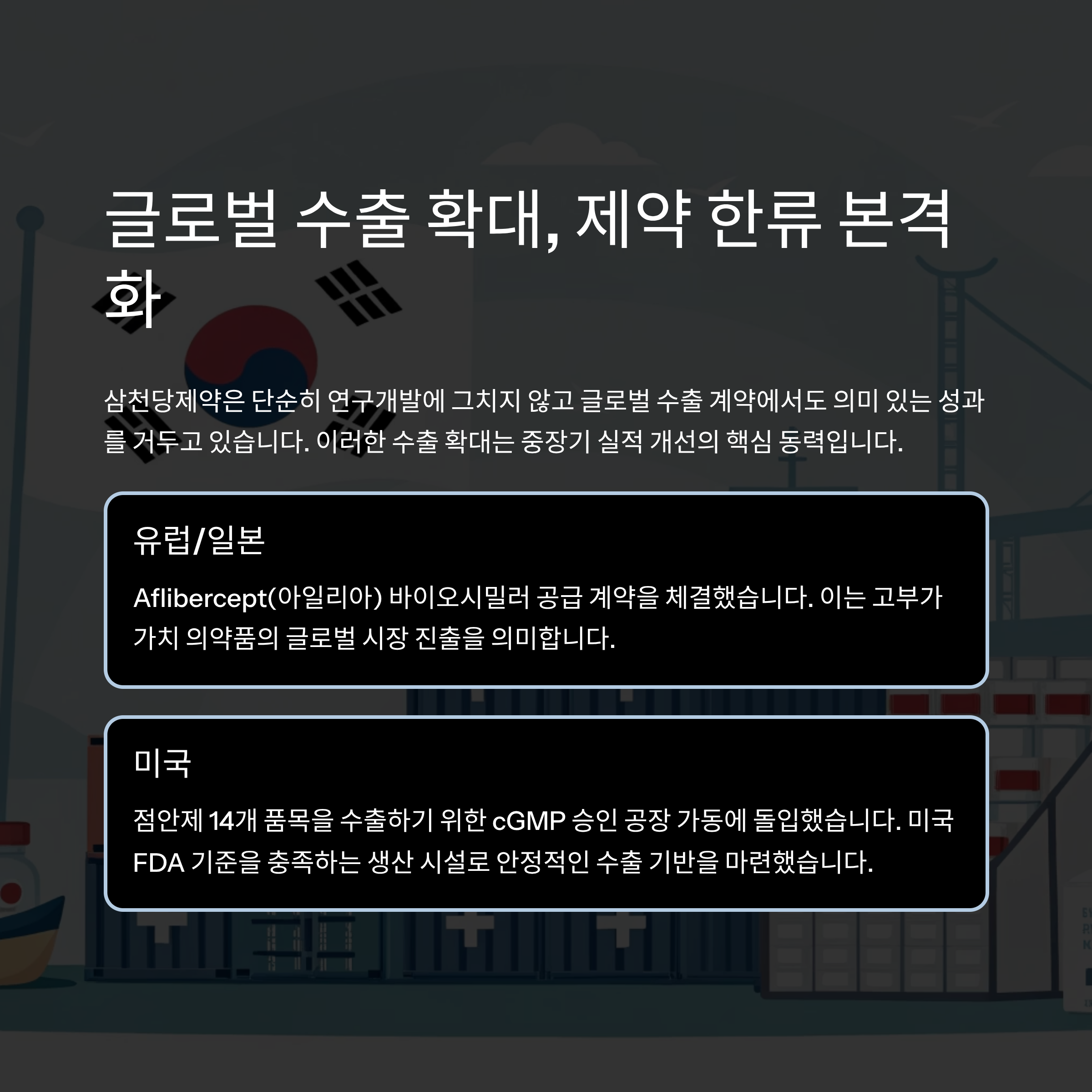 유럽·일본 제약사들과 Aflibercept(아일리아) 바이오시밀러 공급 계약을 체결했으며