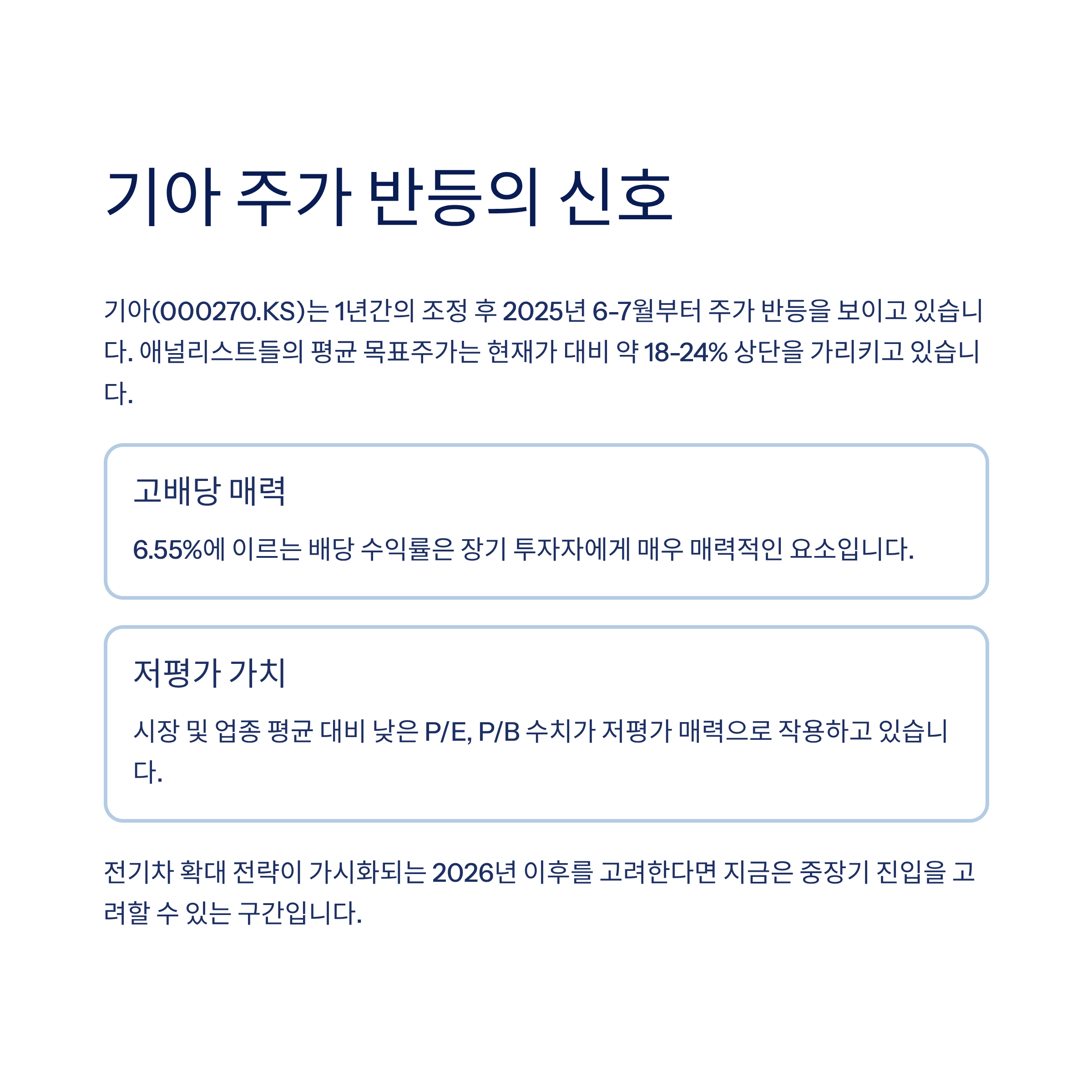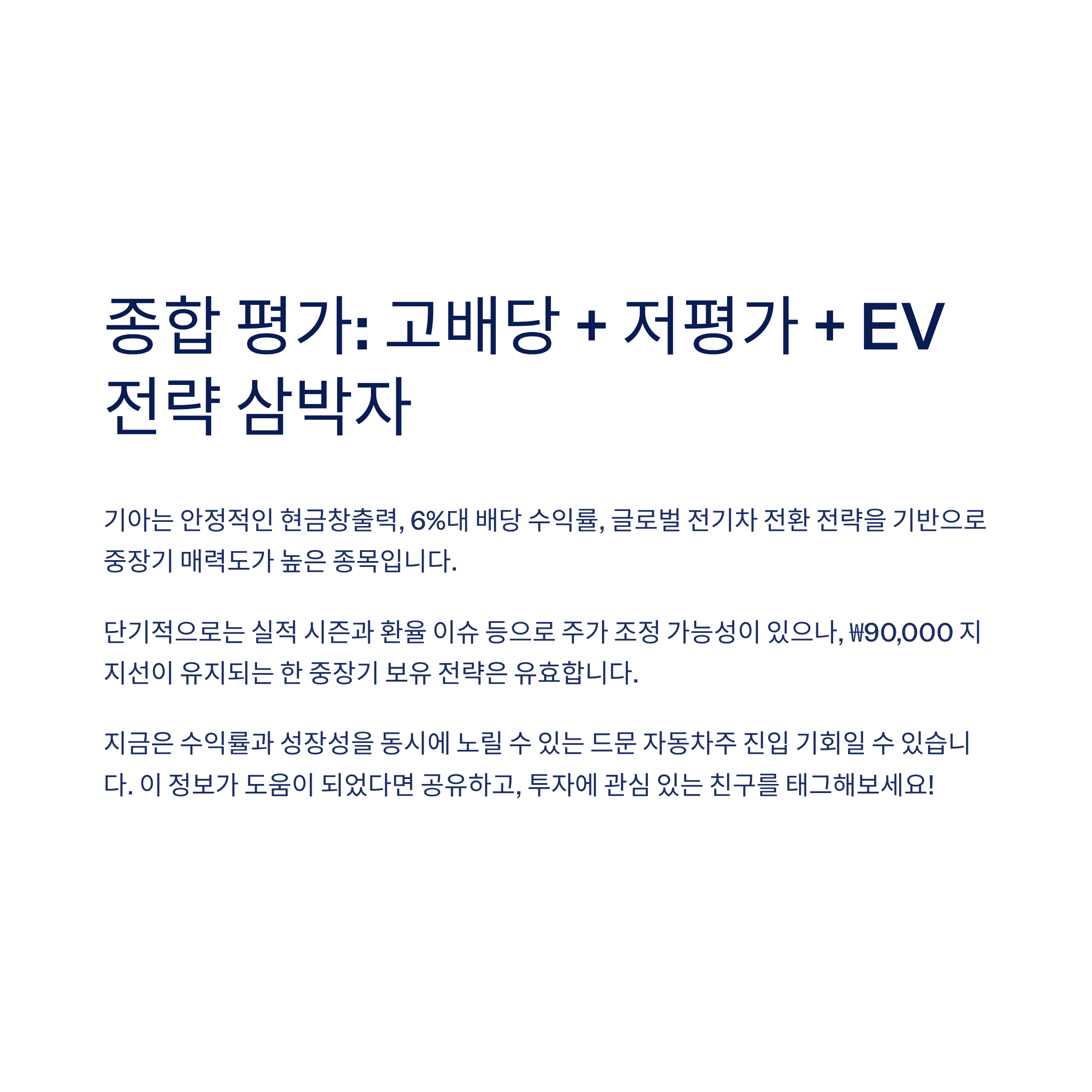 기아(000270.KS)는 최근 1년간 조정을 거친 후 2025년 6~7월 들어 주가 반등을 보이고 있습니다. 애널리스트 평균 목표주가는 현재가 대비 약 18~24% 상단을 가리키고 있으며, 특히 6.55%에 이르는 고배당 수익률은 장기 투자자에게 매우 매력적인 요소입니다. 밸류에이션 측면에서 시장 및 업종 평균 대비 낮은 P/E, P/B 수치 또한 저평가 매력으로 작용하고 있습니다. 전기차 확대 전략이 가시화되는 2026년 이후를 고려한다면 지금은 중장기 진입을 고려할 수 있는 구간입니다.