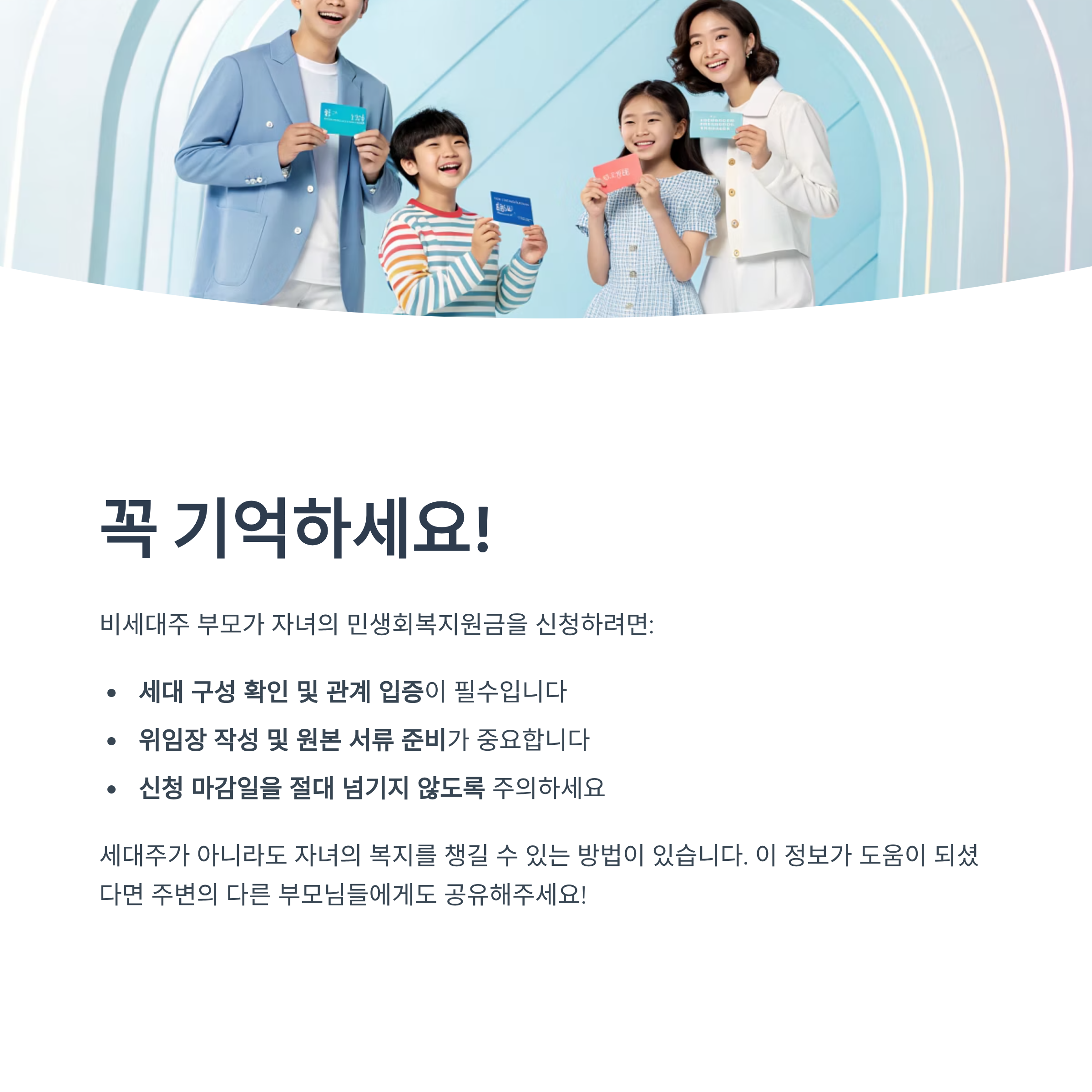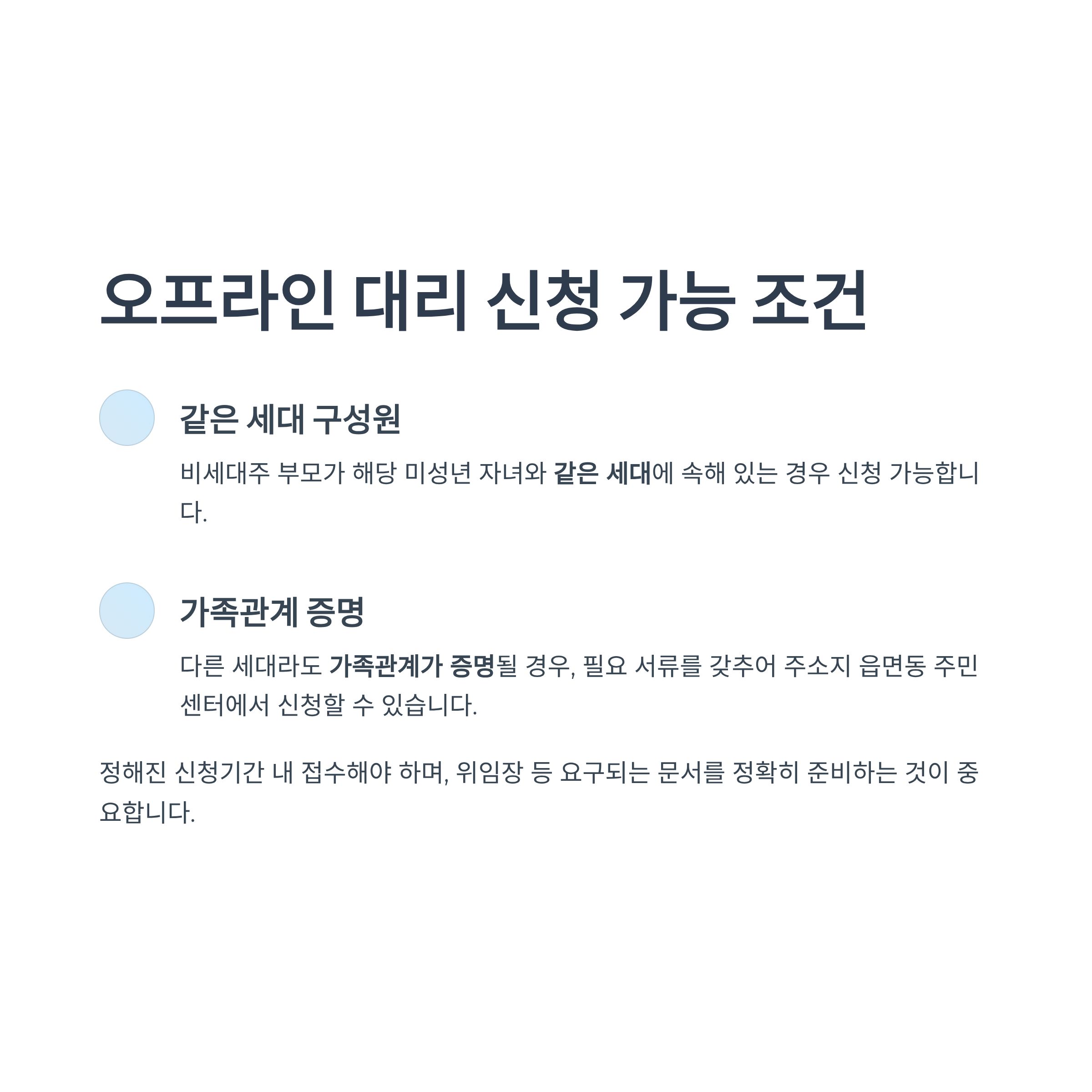 만약 세대주가 사망, 해외 체류, 거주불명 등의 사유로 직접 신청이 불가능한 경우, 비세대주 부모가 대신 신청할 수 있습니다.