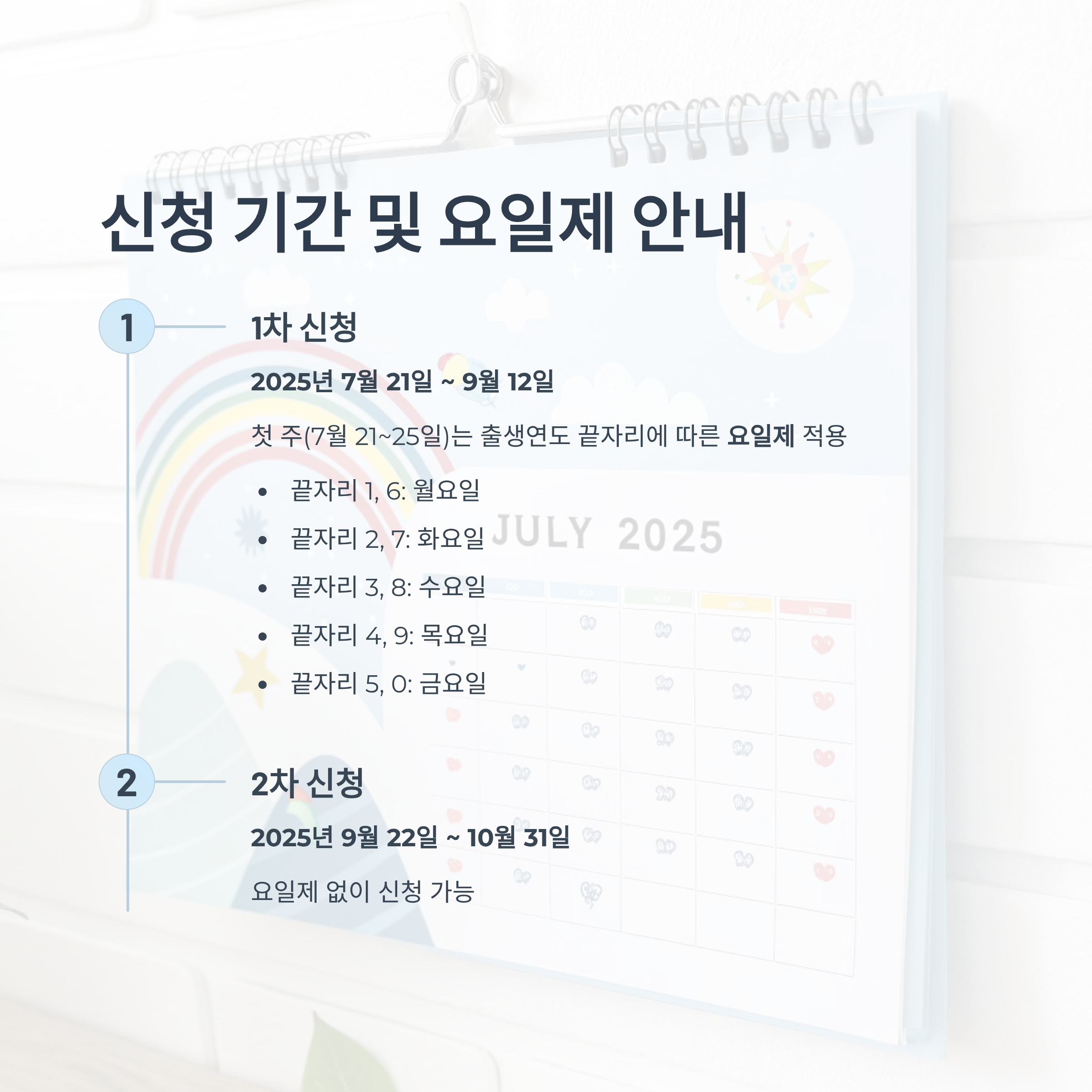 1차 신청 기간은 2025년 7월 21일부터 9월 12일까지이며, 첫 주(7월 21~25일)는 출생연도 끝자리에 따라 신청 요일이 정해지는 요일제가 적용됩니다.