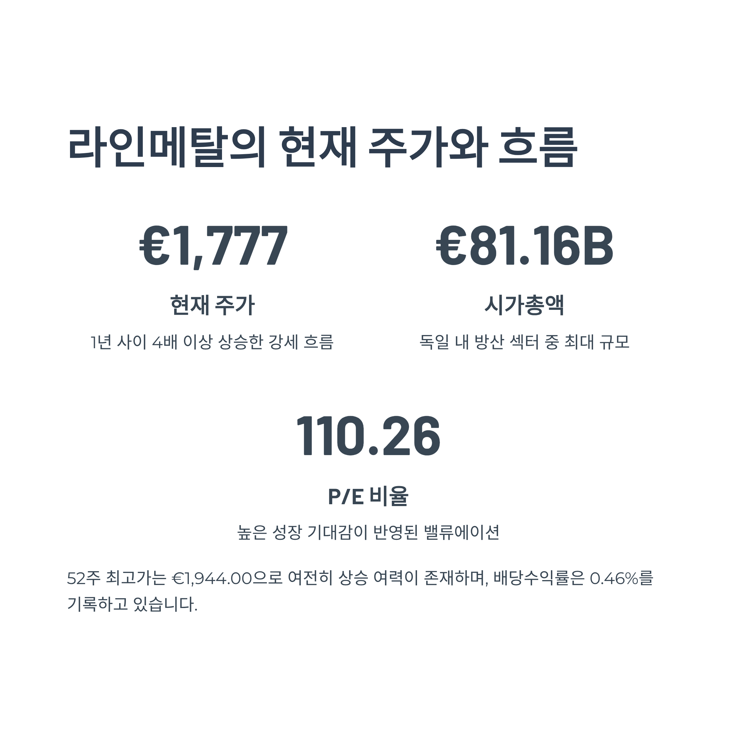 €81.16B로 독일 내 방산 섹터 중 최대 규모를 자랑하며, 52주 최고가는