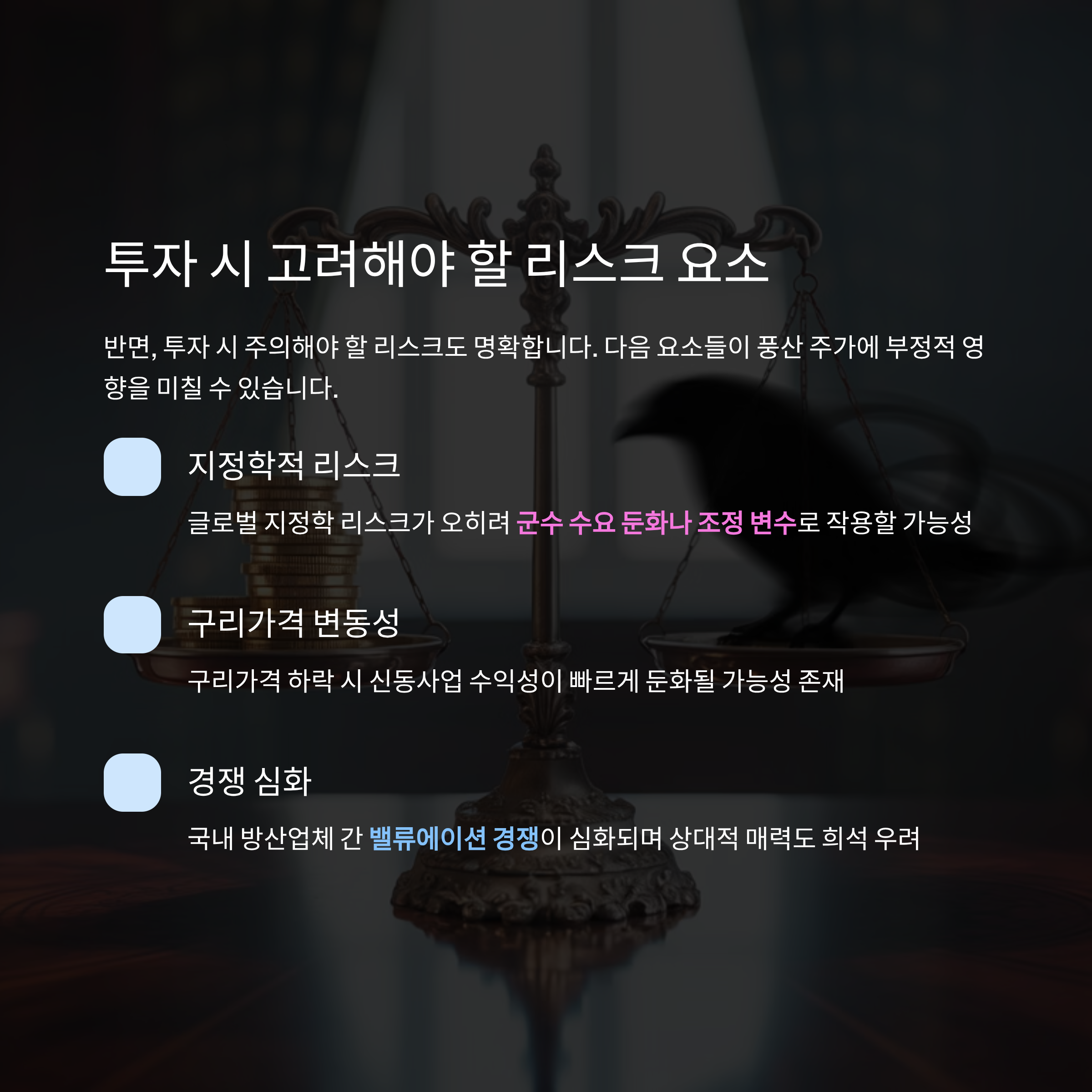 글로벌 지정학 리스크가 오히려 군수 수요 둔화나 조정 변수로 작용할 수 있고,