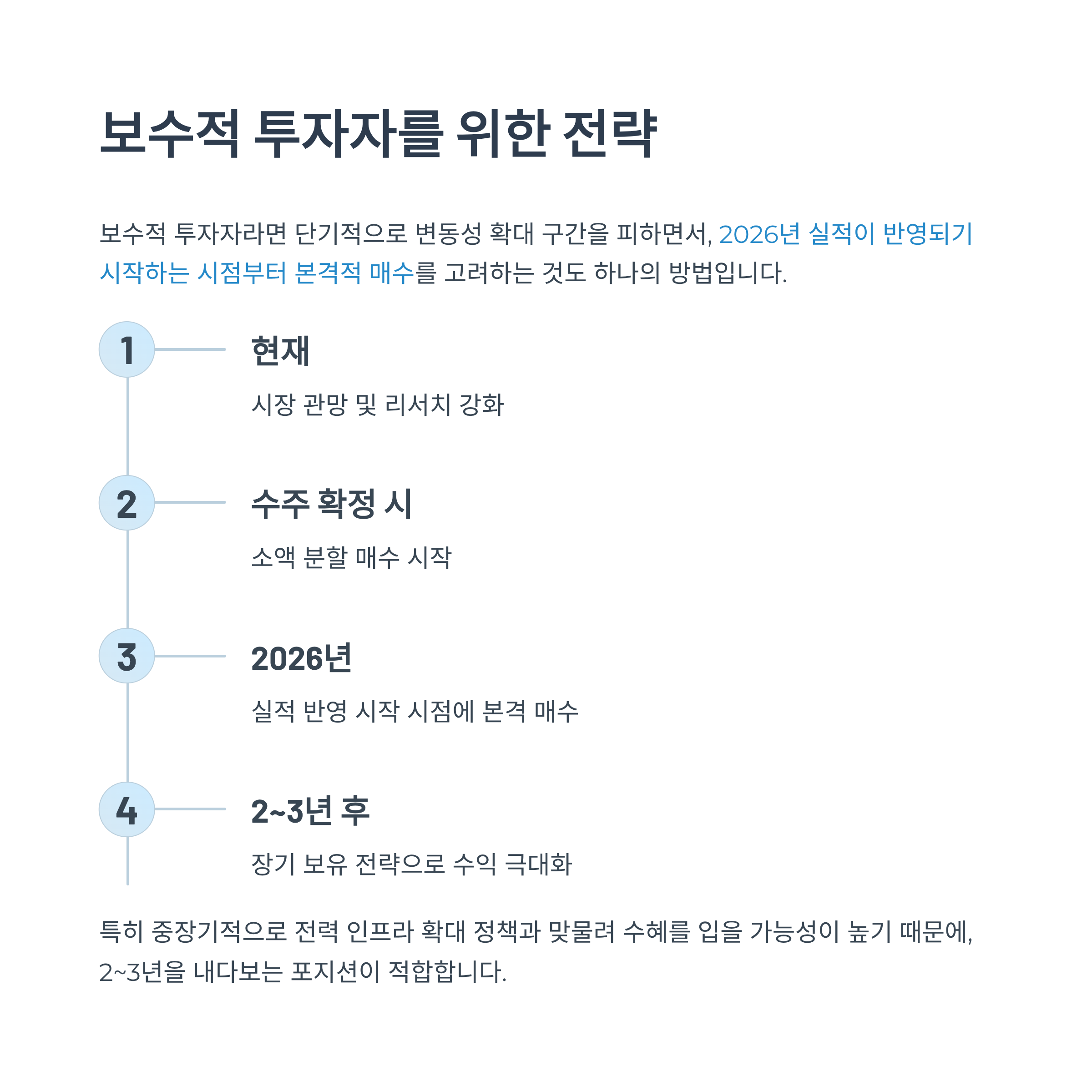 단기적으로 변동성 확대 구간을 피하면서, 2026년 실적이 반영되기 시작하는 시점부터 본격적 매수를 고려하는 것도 하나의 방법입니다. 특히 중장기적으로 전력 인프라 확대 정책과 맞물려 수혜를 입을 가능성이 높기 때문에, 2~3년을 내다보는 포지션이 적합합니다.