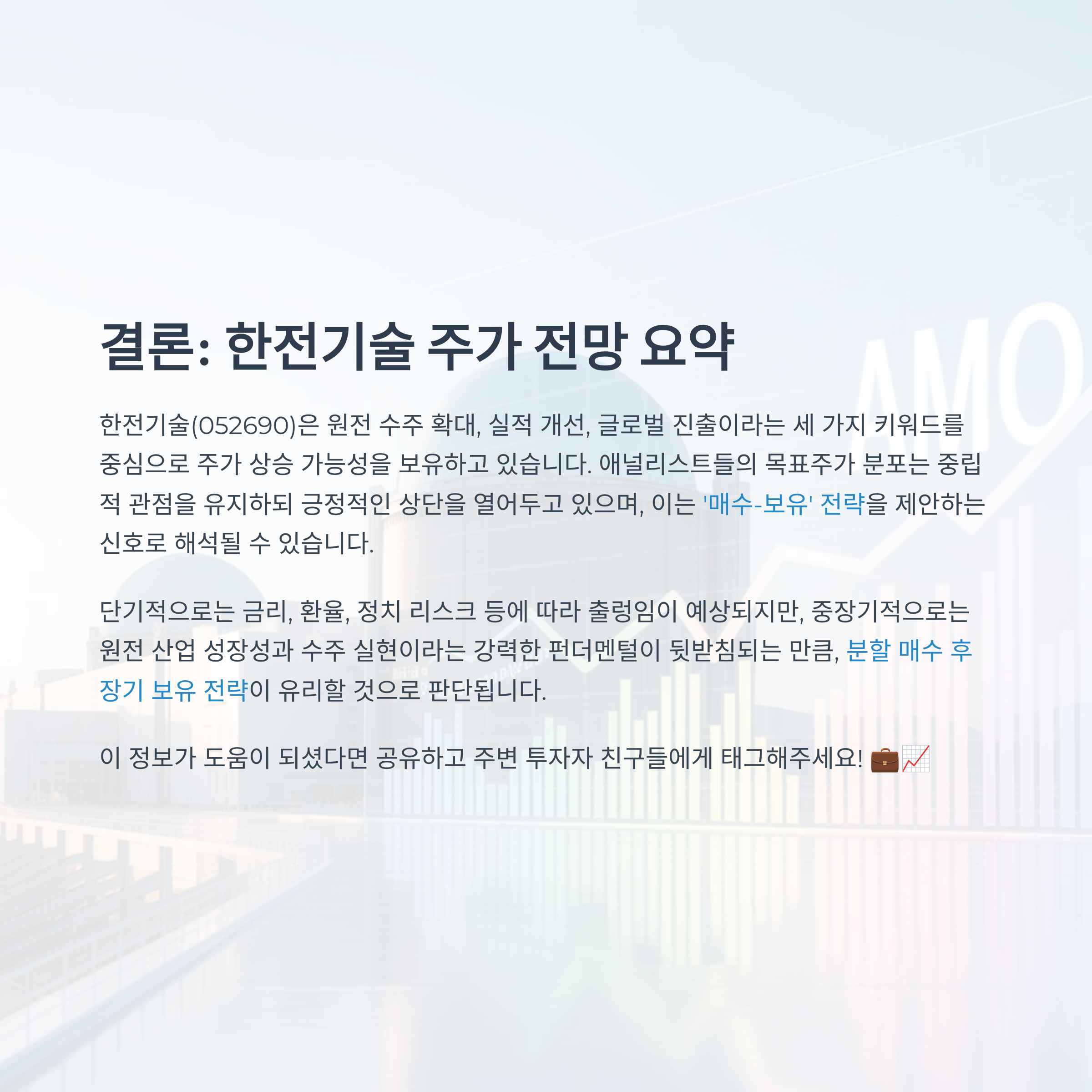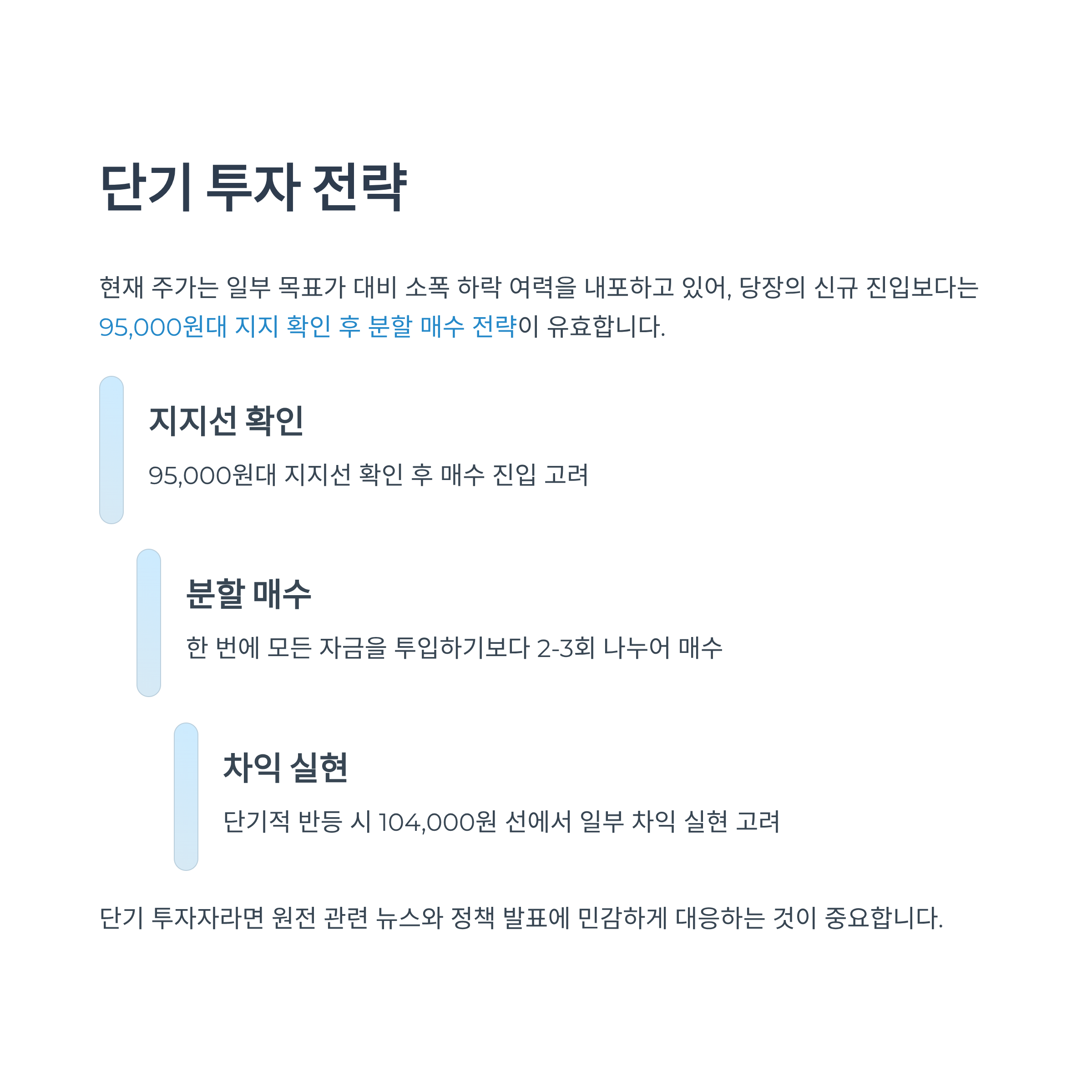 물론 단기적으로는 금리, 환율, 정치 리스크 등에 따라 출렁임이 예상되지만, 중장기적으로는 원전 산업 성장성과 수주 실현이라는 강력한 펀더멘털이 뒷받침되는 만큼, 분할 매수 후 장기 보유 전략이 유리할 것으로 판단됩니다.