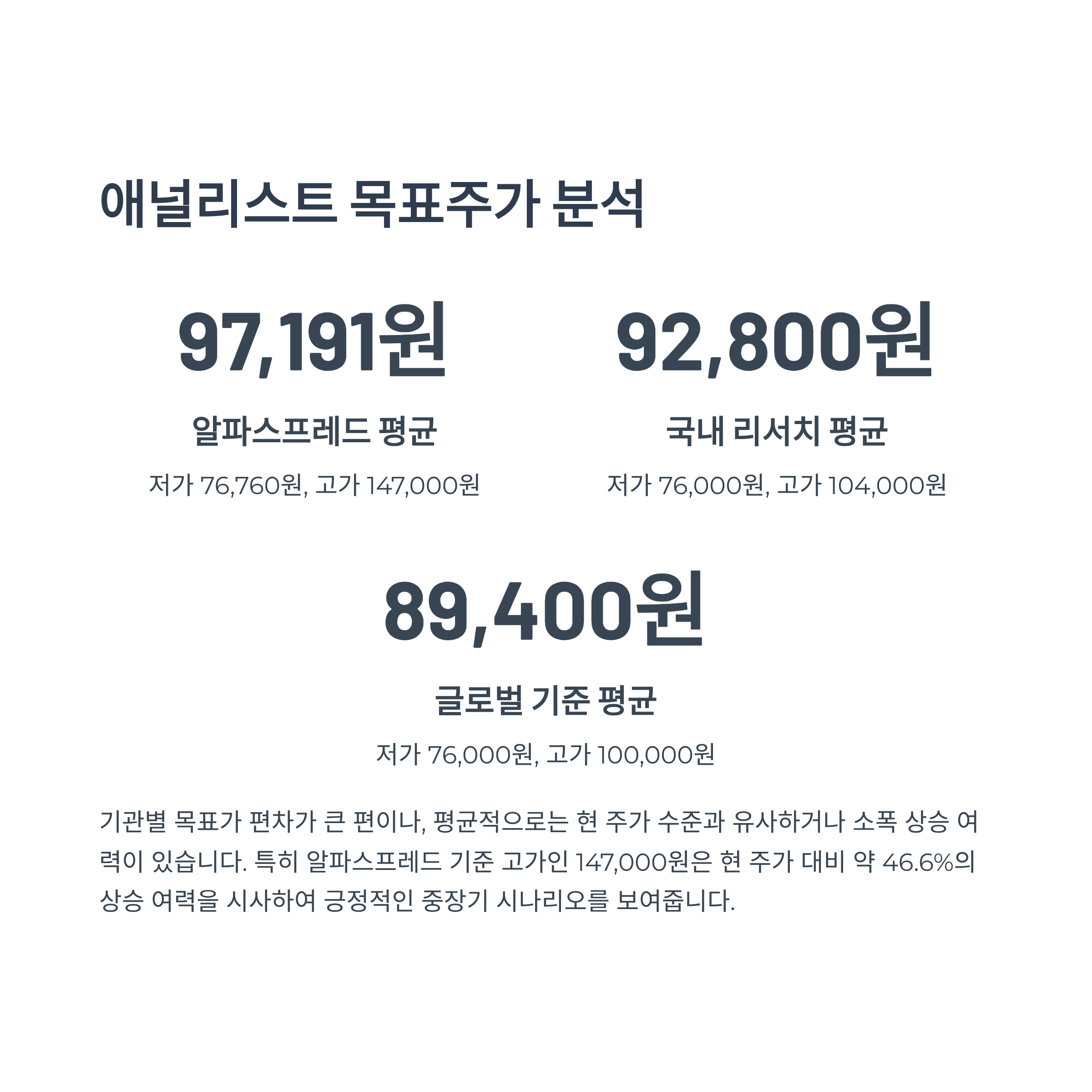 이를 보면 기관별 목표가 편차가 큰 편이나, 평균적으로는 현 주가 수준과 유사하거나 소폭 상승 여력이 있음을 알 수 있습니다. 특히 알파스프레드 기준 고가인 147,000원은 현 주가 대비 약 46.6%의 상승 여력을 시사하여 긍정적인 중장기 시나리오를 가능케 합니다.