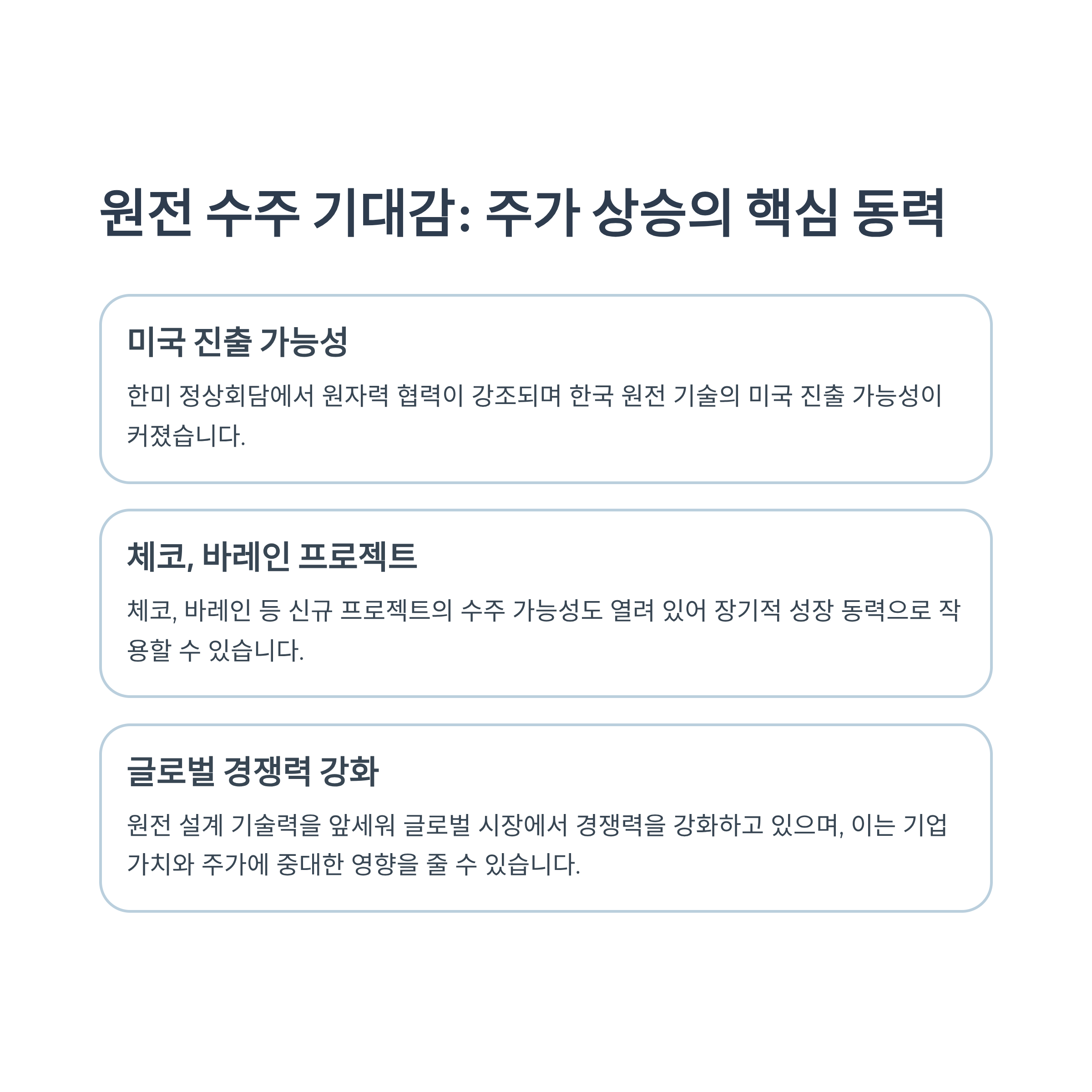 최근 들어 미국, 체코, 바레인 등 해외 원전 수주 가능성이 부각되며 투자자들의 관심이 집중되고 있습니다.
